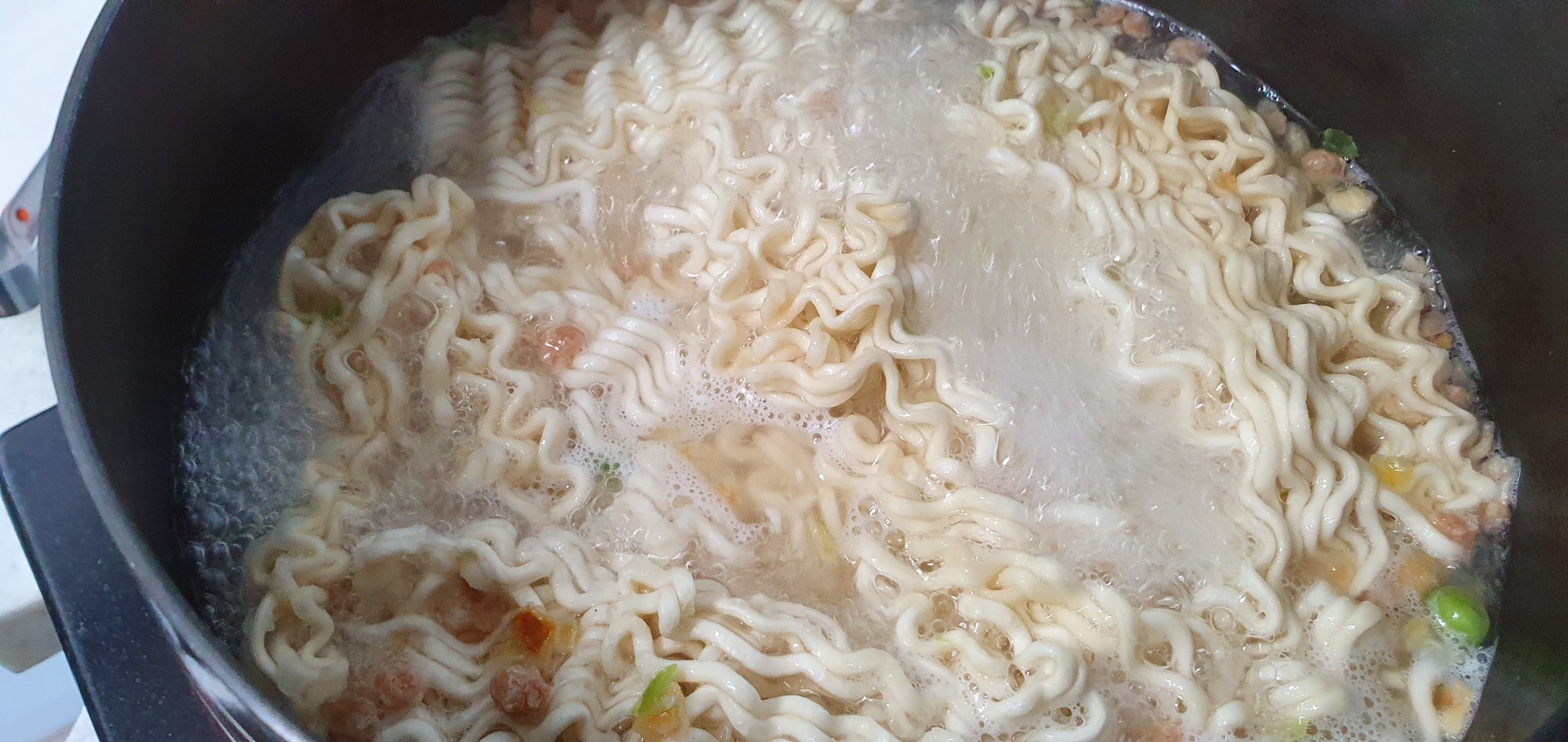 후추를 넣어주고 미원은 살짝만 솔솔 뿌려주면 된다. 그리고 마지막으로 짜장라면에 포함되어 있는 액상스프를 개봉하여 투하하여 주면 된다. 앞서 이야기한 대로 액상형 스프를 쓰는 이유는 이미 춘장이 볶아져서 만들어져 있는 가공된 스프이기 때문에, 조리 하기가 간편해서이다. 또한, 곧잘 섞여서 위 사진과 같이 금세 볶아진 짜장 소스가 완성되기 때문이다. 이로써 짜장 소스는 완벽하게 완성되었다!