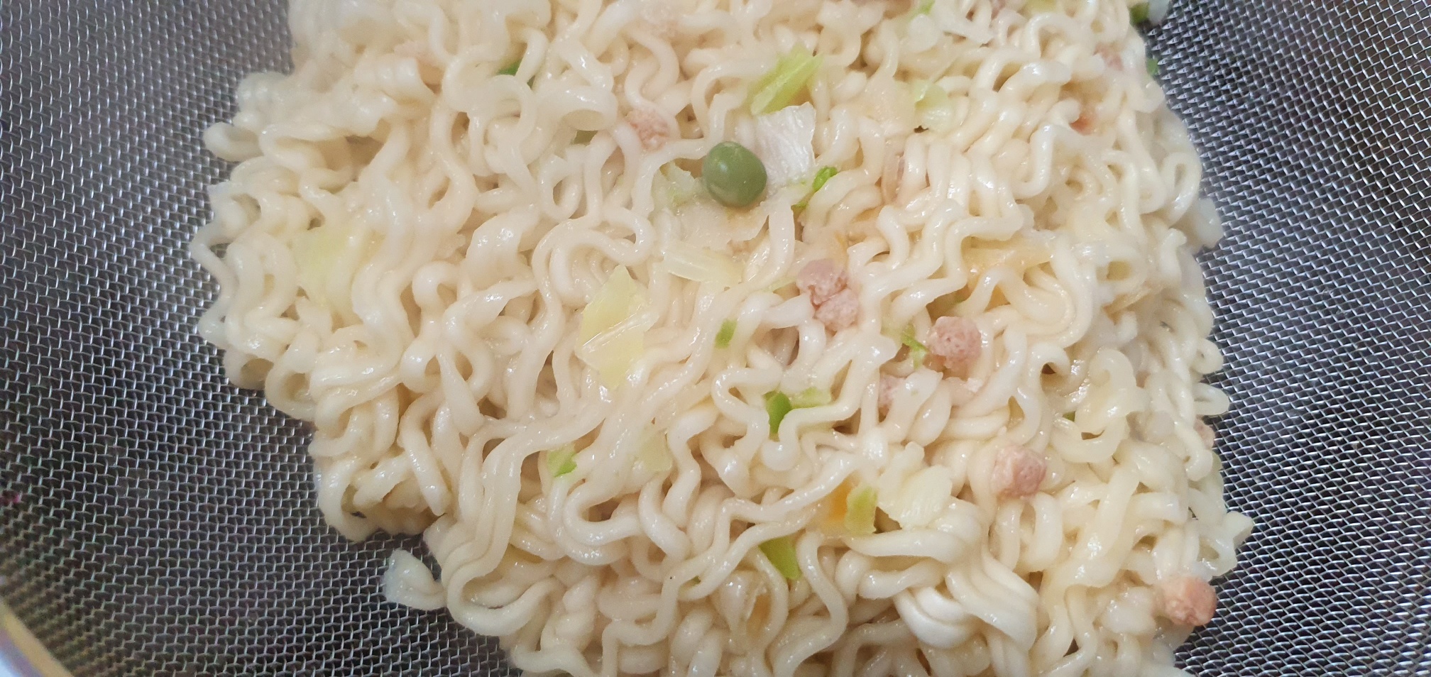 짜장 소스를 볶고 있는 동안 삶고 있었던 면을 채에 건져서 사진에는 없지만, 찬물이나 얼음물에 가볍게 헹궈주면 좀 더 탱탱한 면발을 느낄 수 있다 이제 만들어둔 짜장 소스와에 합체만이 기다리고 있다! 이제 가볍게 비벼 보도록 하자!