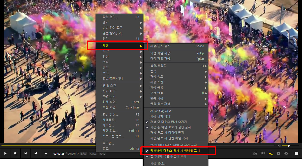 재생 - 탐색 바에 마우스 위치 시 썸네일 표시에 체크하여준다