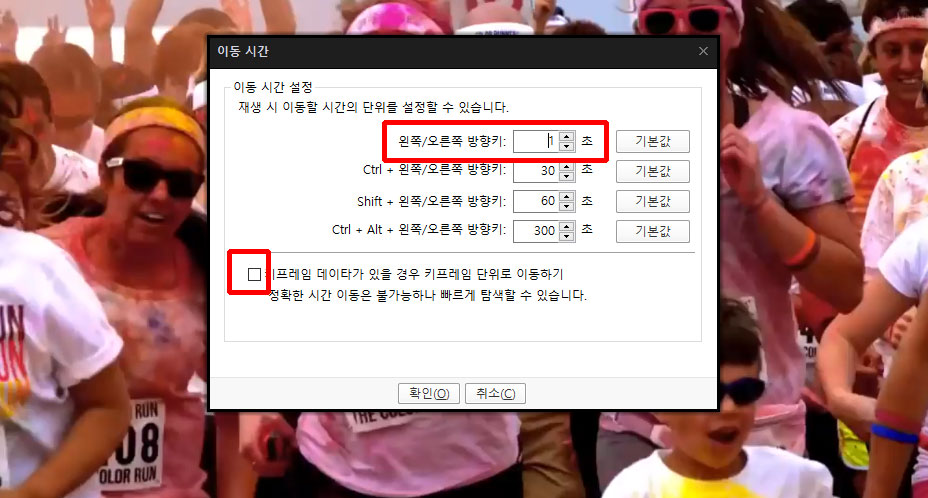 이렇게 설정하여 두고 소지한 영상을 재생시킨 후 방향키를 앞뒤로 눌러보면 정확하게 1초씩 이동하는 것을 확인할 수 있다.