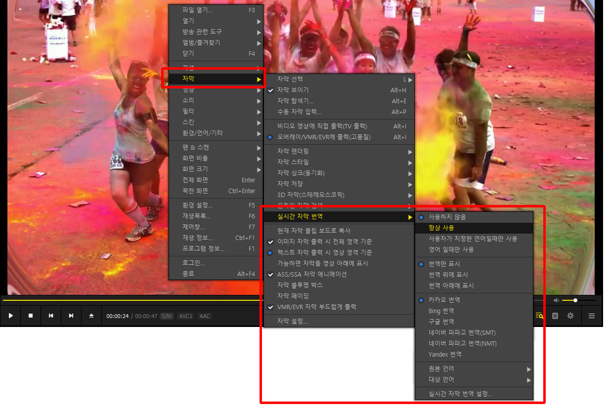 유튜브에서 간혹 사용하는 기능 중에, 자막 기능이 있을 것이다. 가령 미리 사전에 해당 언어의 자막을 만들어 놓은 영상이 아니라면, 자막이 있을 리가 없는데, 유튜브에는 실시간으로 자동 번역하여 주는 기능이 존재한다. 그런데 마찬가지로 팟플레이어에도 이러한 기능을 지원하여 주고 있고 꽤나 유용하게 사용되고 있어 소개해 드리고자 한다. 마찬가지로 설정법은 오른쪽 마우스 버튼 누른 후 아래와 같이 설정하시면 된다.