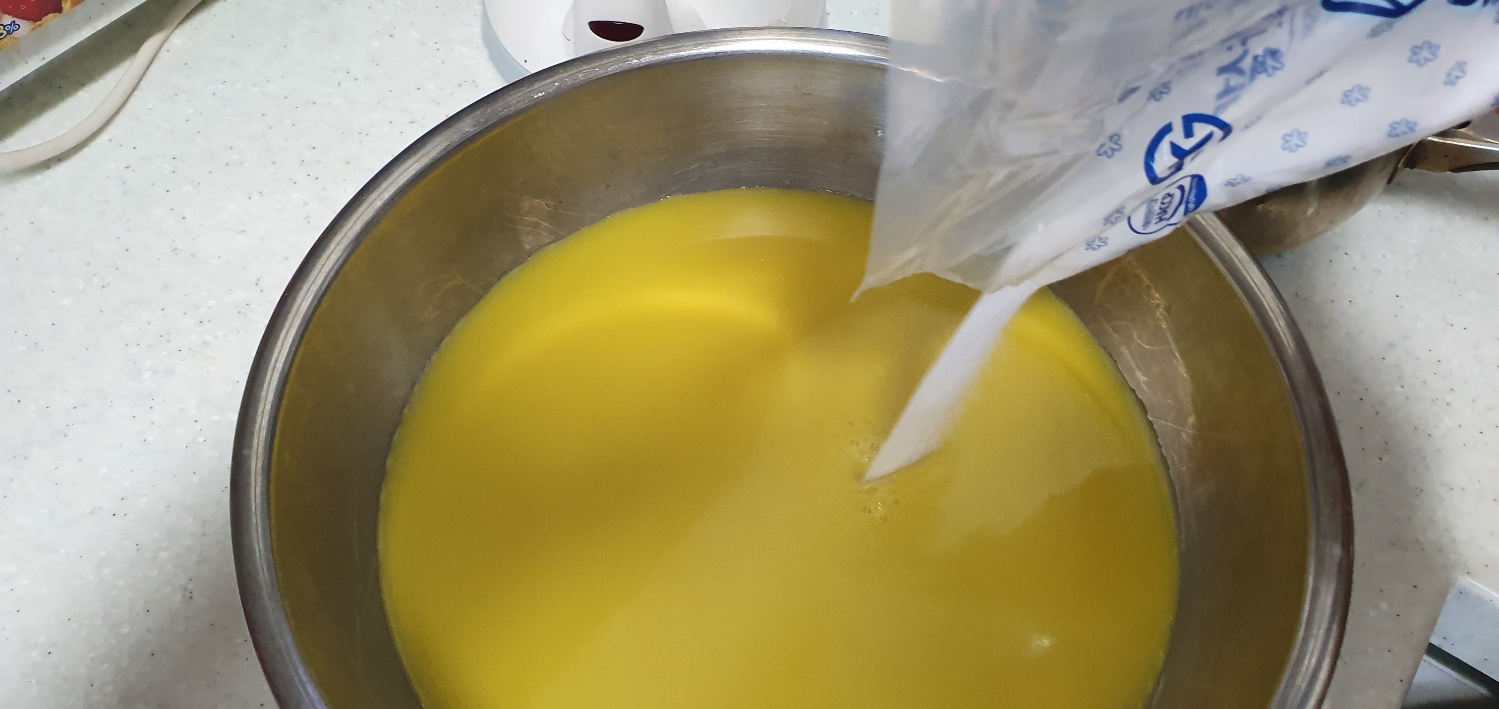 2. 생강전분이 걸러진 생강즙과 같이 착즙 해주었던, 배즙을 섞어주도록 하자! 잘 저어서 섞어 주었다면 1:1로 위 두 번째 사진과 같이, 설탕을 넣어 주고 저어주면 되는데 이때 설탕의 비율은 1:1로 넣어주면 된다. 즙이 1Kg라면 설탕도 1Kg를 넣어주면 되는 것이다. 이제 다 마지막 작업만이 남은 상태다!