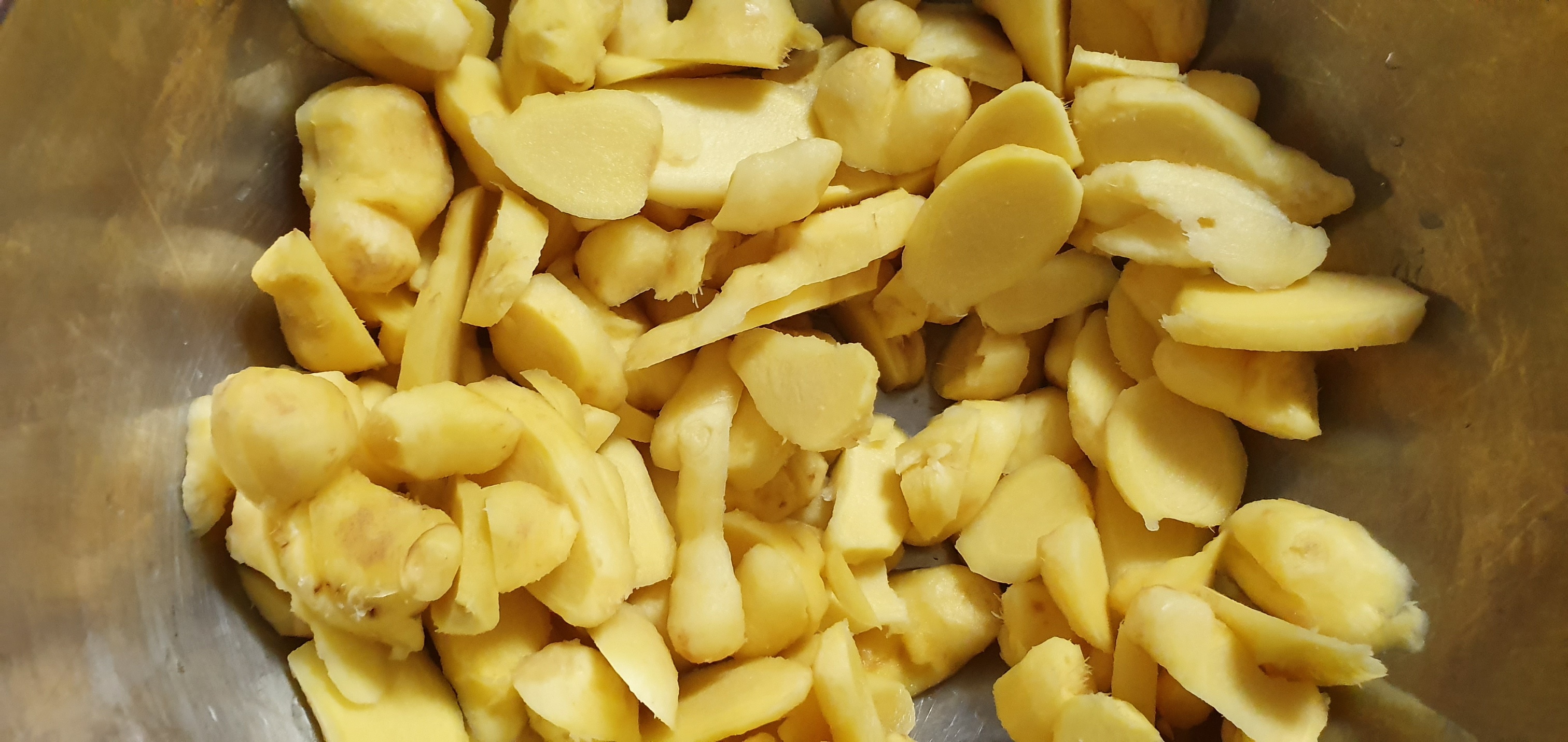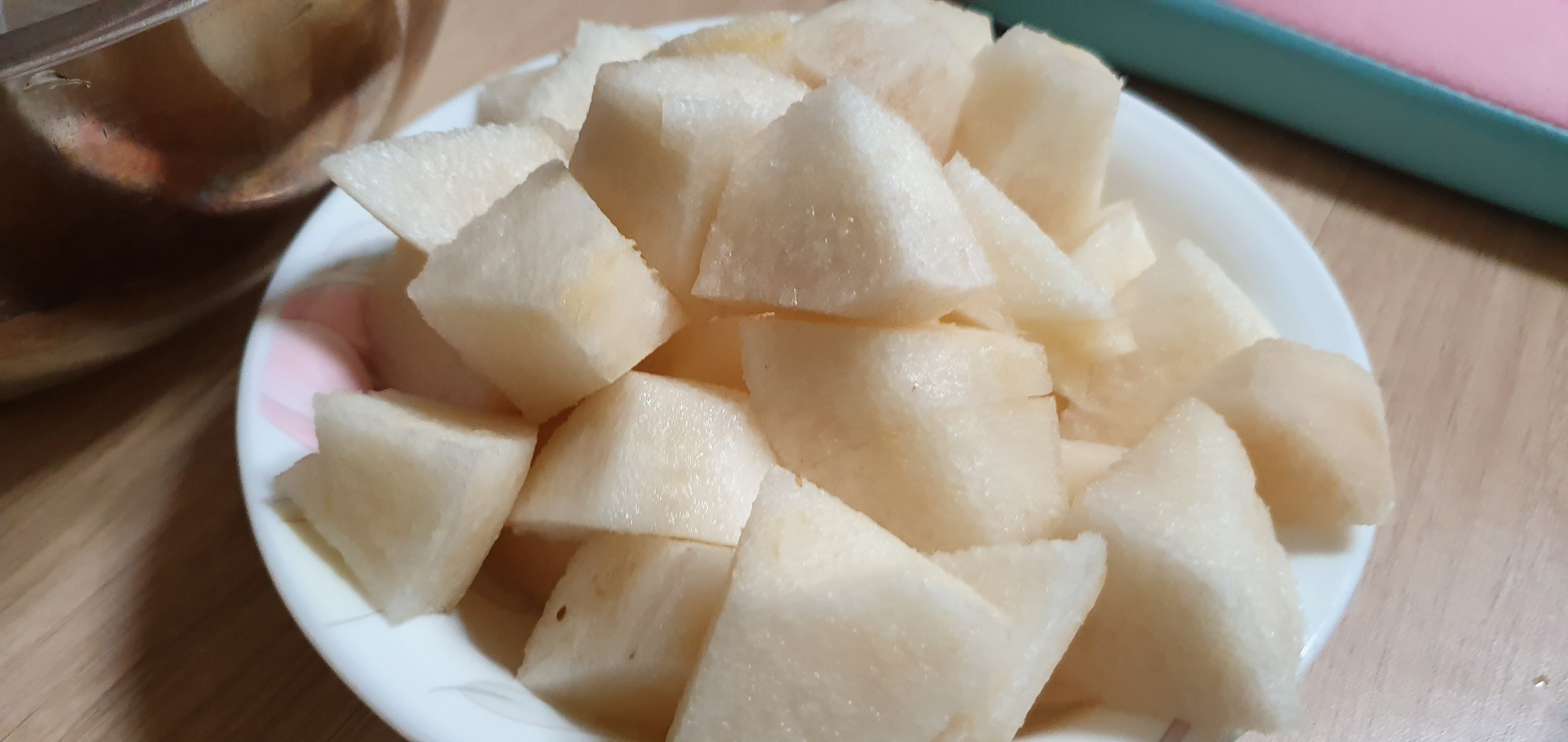 당연하게도 생강청을 만들 것이기 때문에, 생강이 반드시 필요하다! 필자는 인터넷을 통해 생강 3Kg을 미리 준비해 두었고, 집에서 모두 손질하여 위 사진과 같이, 칼로 잘라서 양푼에 모아두었다. 역시 생강은 손질하는 게 시간을 많이 잡아먹는다. 배는 2개 정도만 넣어도 충분할 것 같아서, 배 2개도 마찬가지로 위와같이 잘라서 위와 같이 정리해두었다. 그런데, 왜 이렇게 잘라 두었는지는 아래 내용을 보면 알 수 있다.