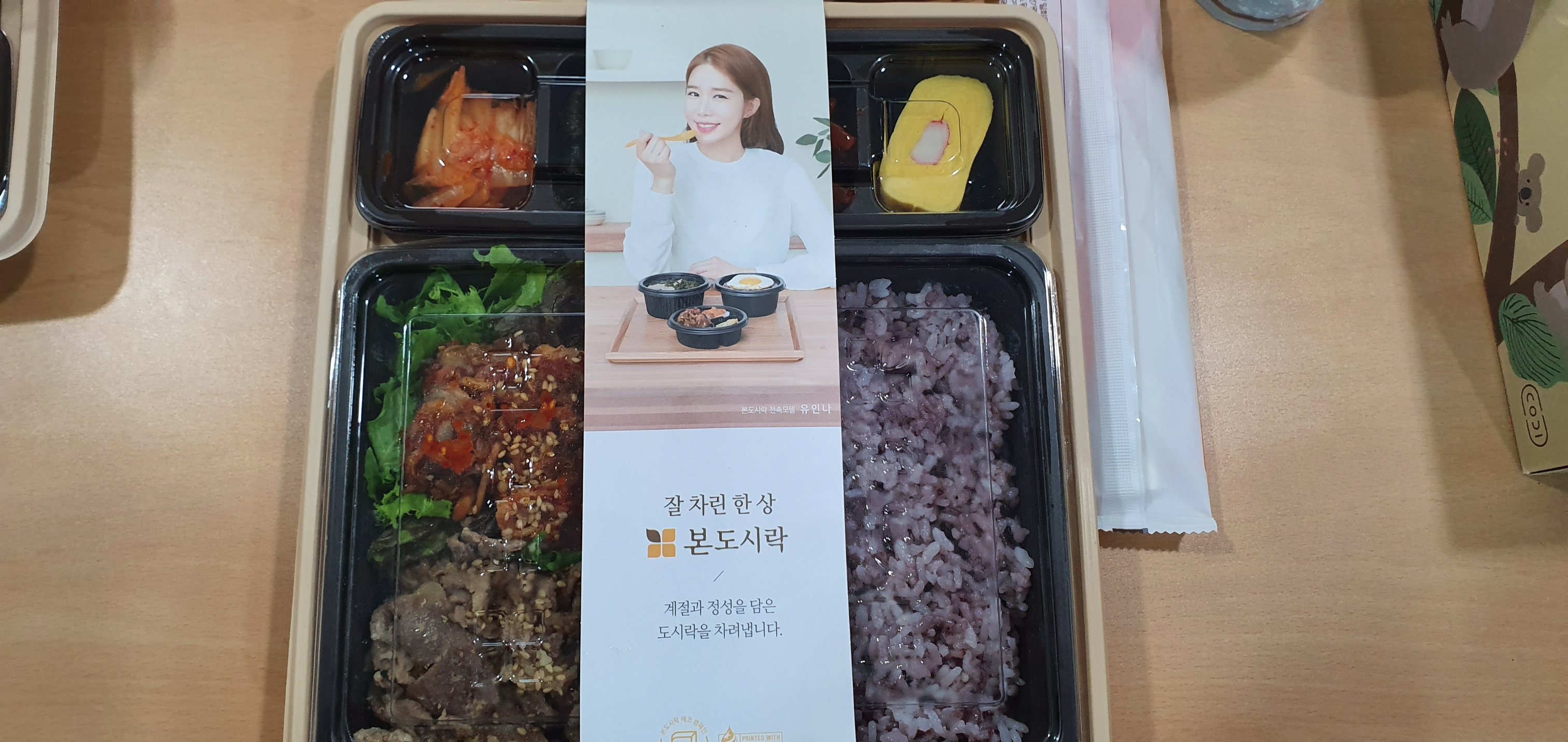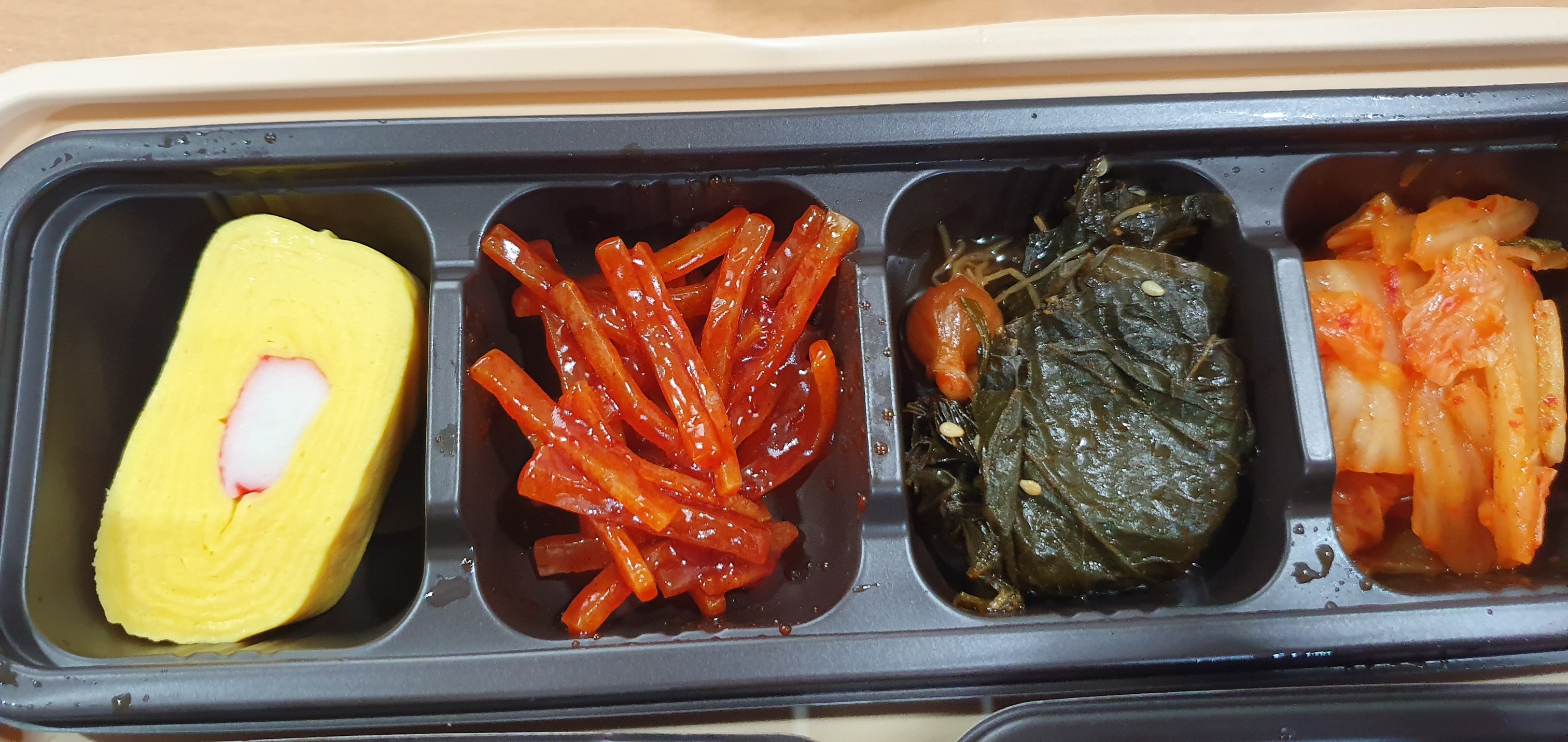 구성은 위와 같다. 양은 많지도 적지도 않은 적당한 정도이다. 밥의 양도 한 끼 식사로 부족하지는 않았다. 필자는 사실 꼬막을 많이 좋아한다. 나름 식객인 필자는 꼬막 철에는 벌교에 가서 꼬막을 먹고 오기도 한다. 광양불고기도 코스 중에 한 곳이기도 하다. 도시락과 비교하는 것은 아니지만, 필자가 아는 맛은 아니라 사실 조금 실망하였다. 도시락이라는 특성일 것이라 이해하기로 하였는데, 사실 안타깝지만 꼬막은 비릿한 맛이 나서, 남길 수밖에 없었다. 불고기는 편의점용 도시락에 있는 돼지 불고기와 크게 차이가 없다는 점에 조금 실망하기도 하였다. 반찬의 전체적인 느낌은 조금씩 정갈하게 담겨 있는 느낌이었고, 더도 말고 덜도 말고 딱 반찬다운 맛을 내고 있었다. 도시락은 조미김으로 마무리하고 후식으로 마신 단호박 식혜는 나쁘지 않았다.