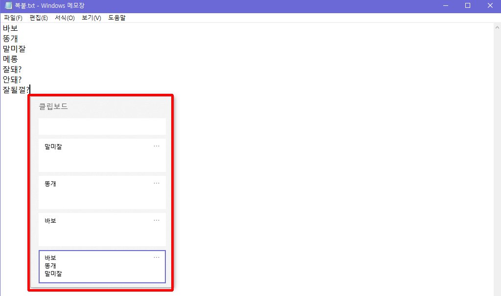 복사를 정상적으로 모두 진행하였다면, 이제 붙여 넣어야 하는데 우리가 알고 있던 Ctrl+V로 붙여 넣지 않는다. 우리의 키보드에는 좌우에 배치되어 있는 Ctrl 키와 Alt 키 사이에 윈도우 로고 모양의 키가 있다는 것을 알고 있을 것이다. 이 윈도우키가 윈도우 내에서 의외로 많은 단축키를 사용할 수 있는 펑션키로 활용되고는 하는데 잘 모르는 유저가 대다수이기 때문에, 아는사람만 활용한다는 키가 바로 윈도우 키이기도 하다! 위에서 진행한 대로 복사를 모두 진행했다면, 소제목에 쓰여있는 Win+V 를 눌러보도록 하자 그러면 위 이미지와 같이 클립보드라는 것이 나타나게 되는데 이때 복사하였던 내용들이 전부 나타나게 된다. 위 이미지처럼 전체 텍스트를 복사한 형태와 각 단어별로 복사했던 기록들이 모두 클립보드에 저장되어 표시되고 있다.