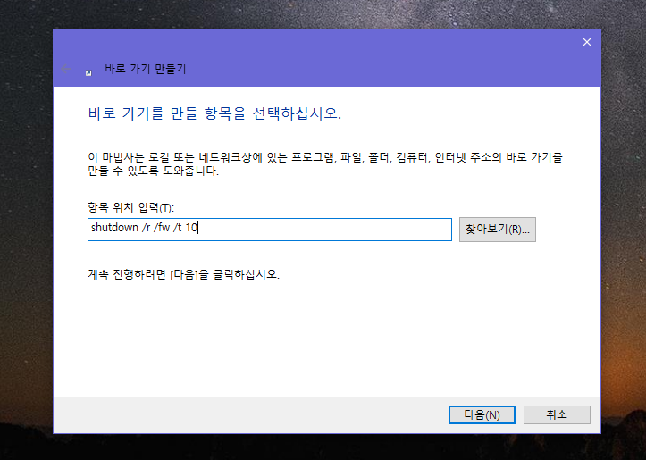 shutdown /r /fw /t 10 > 하단 다음 버튼 클릭하여준다 명령어 작성 시 띄어쓰기에 주의하여 준다