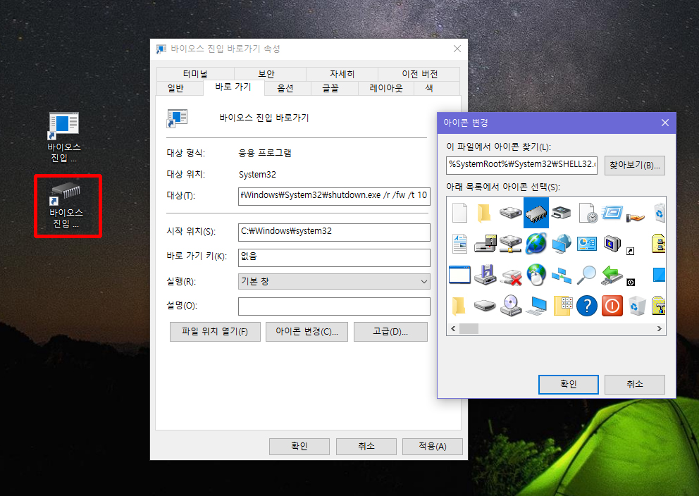 보너스) 바로가기 아이콘이 마음에 들지 않아서 변경하고 싶다면 위 두 번째 사진과 같이, 아이콘을 변경해줄 수 있다. 변경하는 방법은 아래와 같다