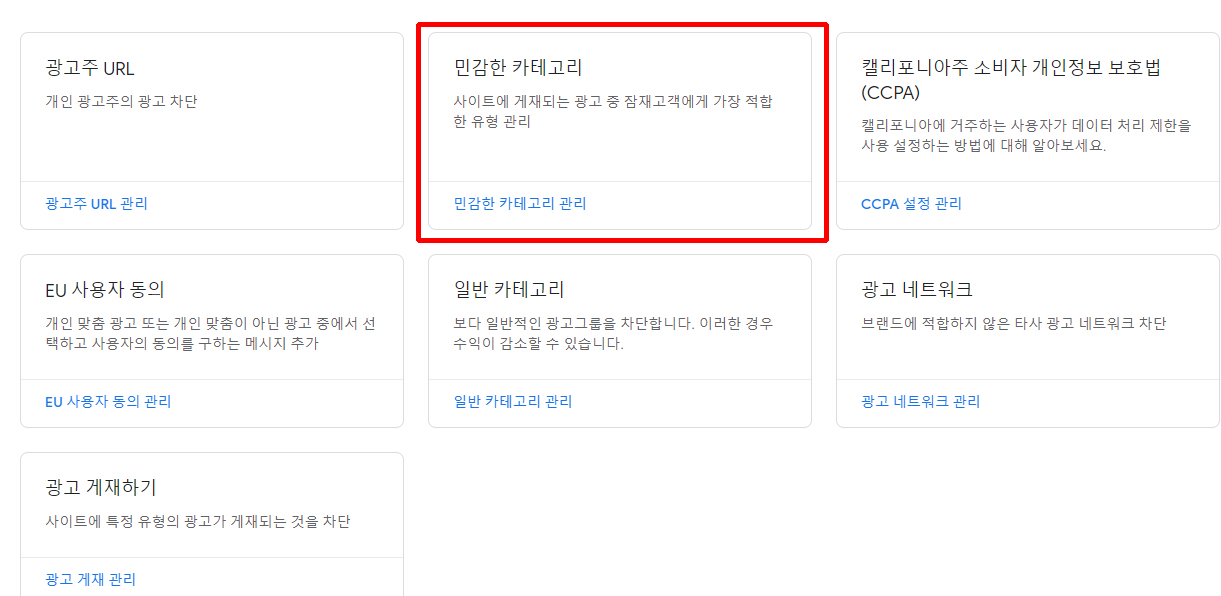 애드센스 관리자에 접속하였다면 왼쪽메뉴에 차단 관리라는 메뉴를 클릭하고 서브메뉴에 나타나는 모든 사이트를 클릭하도록 하자 모든 사이트를 클릭하게 되면 위 이미지와 같이 여러 항목들을 관리할 수 있는 메뉴들이 나타난다. 우리가 이번에 관리해야 할 항목은 이미 한글로 크게 쓰여있는데 빨간색 테두리로 표시해둔 민감한 카테고리 관리라는 파란색 글씨를 클릭해서 이동하도록 하자!