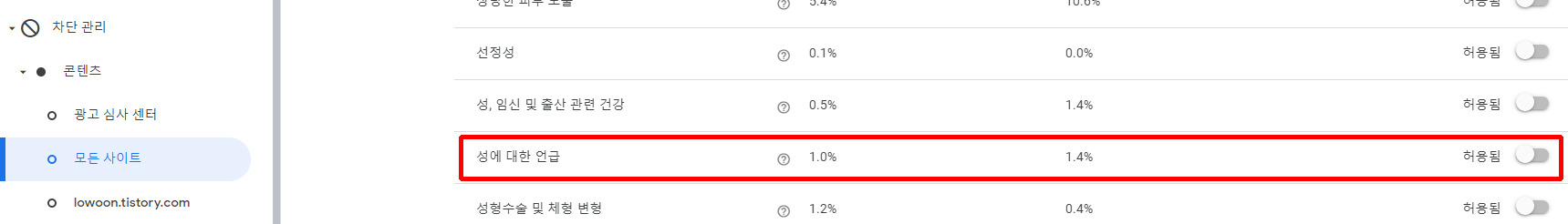 모든 사이트에 적용하길 원하기 때문에 모든사이트 내의 민감한 카테고리를 선택한 것인데, 관리 화면을 확인하여 보면, 위와 같은 화면은 볼 수 있다. '성에 대한 언급'이라는 문구가 보일 것이다. 우측에 보면 기본적으로는 '허용됨'이라고 세팅 단추가 열려 있는 상태이지만, 오른쪽 단추를 클릭하여 주면 '차단됨'으로 변경하여 주면 다시는 성인 관련 광고가 표시되지 않는다.