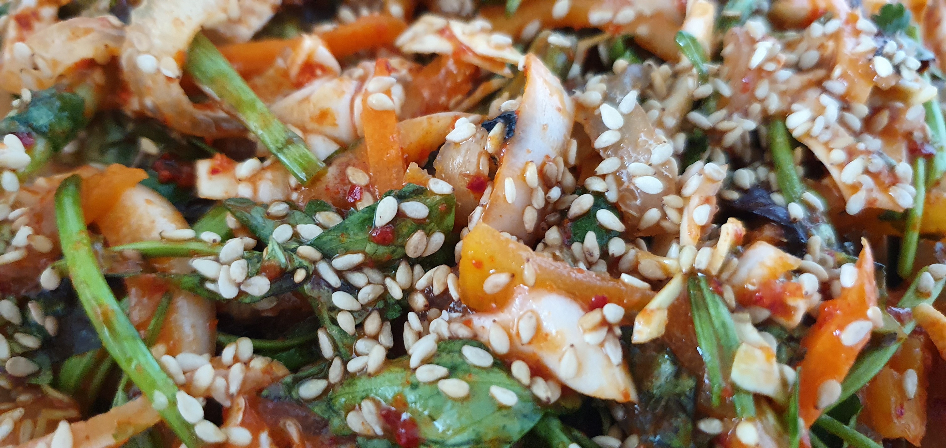 복어껍질은 미나리와 각종 야채들과 함께 버무려져 있었다. 먹어보기위해 한 젓가락 먼저 집어서 입에 넣어보았는데, 살짝 매콤하면서, 새콤한 맛이 입맛을 돋구었다, 의외로 전혀 비리지 않았던 복어 껍질의 쫄깃함이 식감을 더 돋구어 주는 역할을 하였다. 그런데, 그냥 먹으면 섭하니, 횟집 사장님이 별도로 포장해주신 상추와 깻잎 그리고 기타 쌈에 필요한 마늘과 고추를 이용해 먹었는데 여기에 키 포인트는 바로 날치알이다!