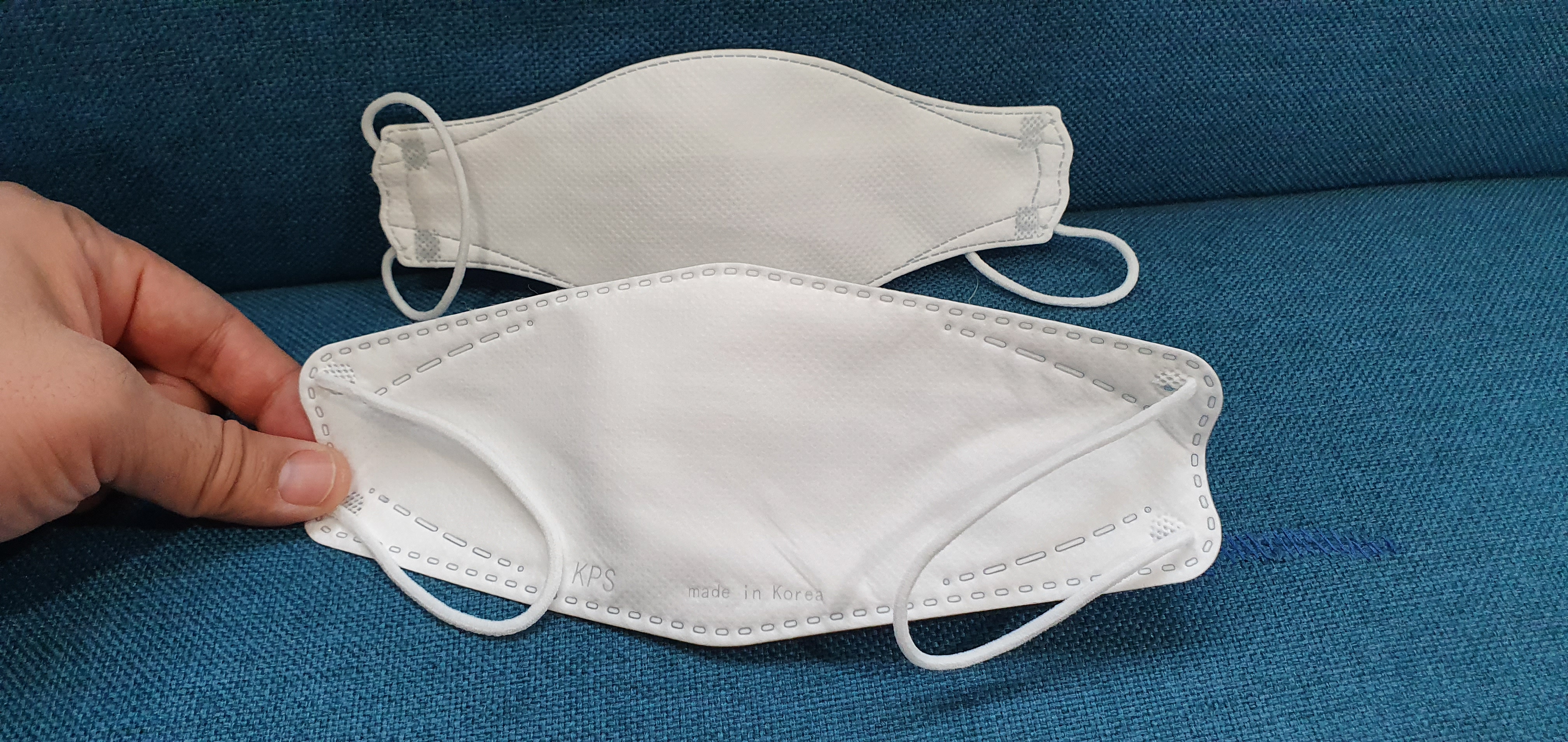필자가 받은 마스크 포장지를 뜯어서 개봉하고 위와 같이 나란히 놓고 비교해 보았다 소형과 대형 크기가 얼마나 차이가 나는가 궁금하기도 했는데, 이렇게 보니, 확실히 어린이와 성인의 얼굴 크기의 차이가 많이 난다는 걸 완벽하게 알 수 있게 되었다. 사진만 봐도 알 수 있다시피, 뒤쪽에 있는 마스크가 소형 마스크이고, 앞쪽에 있는 마스크가 대형 마스크이다.