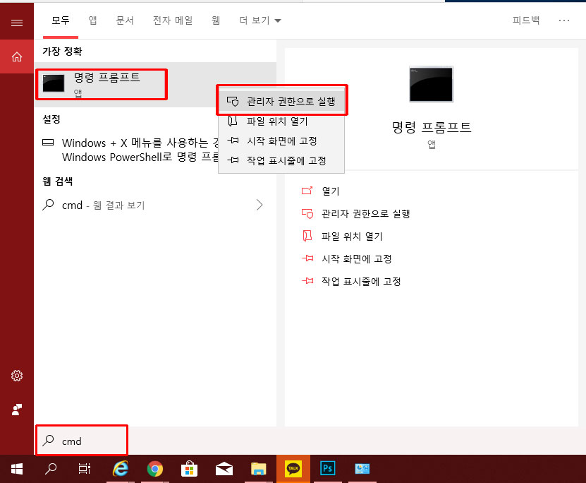 3. 명령프롬프트에 커서를 두고 오른쪽마우스 클릭하여 "관리자 권한으로실행" 을 눌러준다