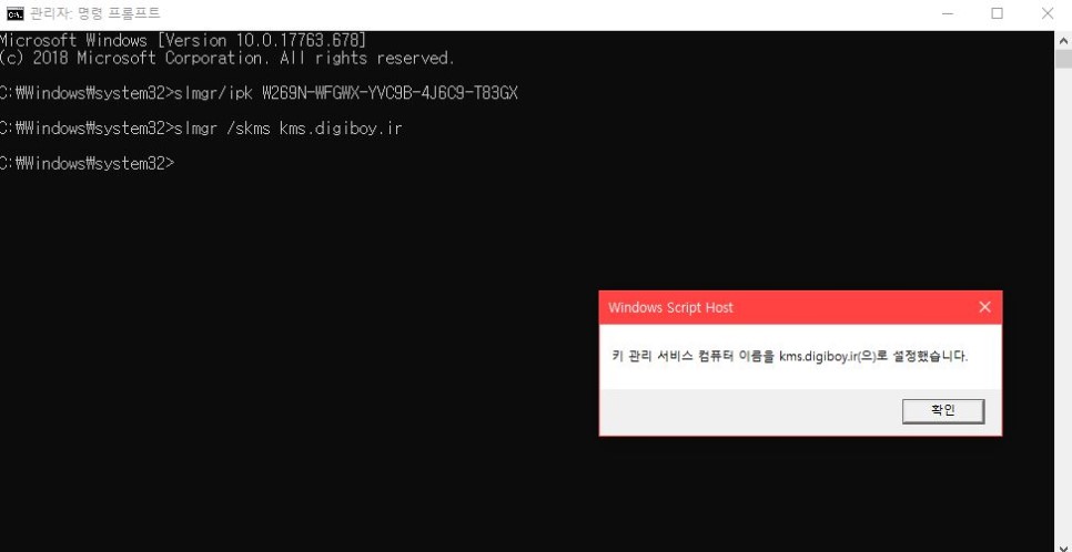 9. 위와 같이, 정품인증확인 창이 나오면 확인을 눌러주신 후 cmd 창을 닫아줍니다
