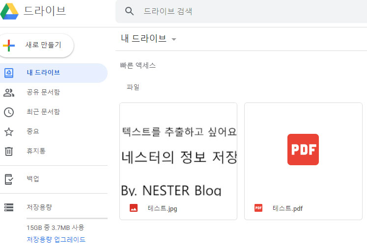 우선 구글 드라이브로 가서 텍스트 추출이 필요한 이미지나 PDF를 등록해보도록 해보죠!