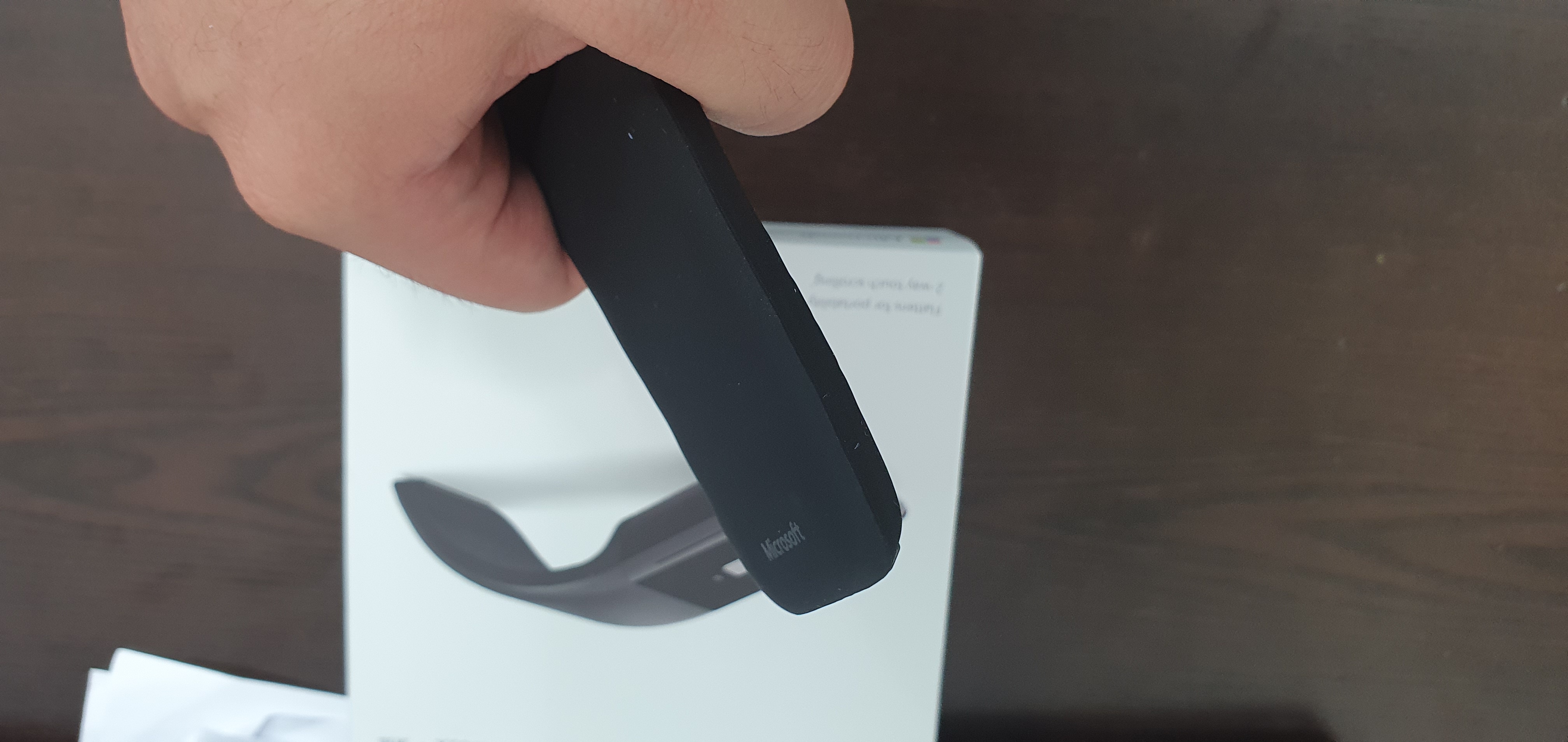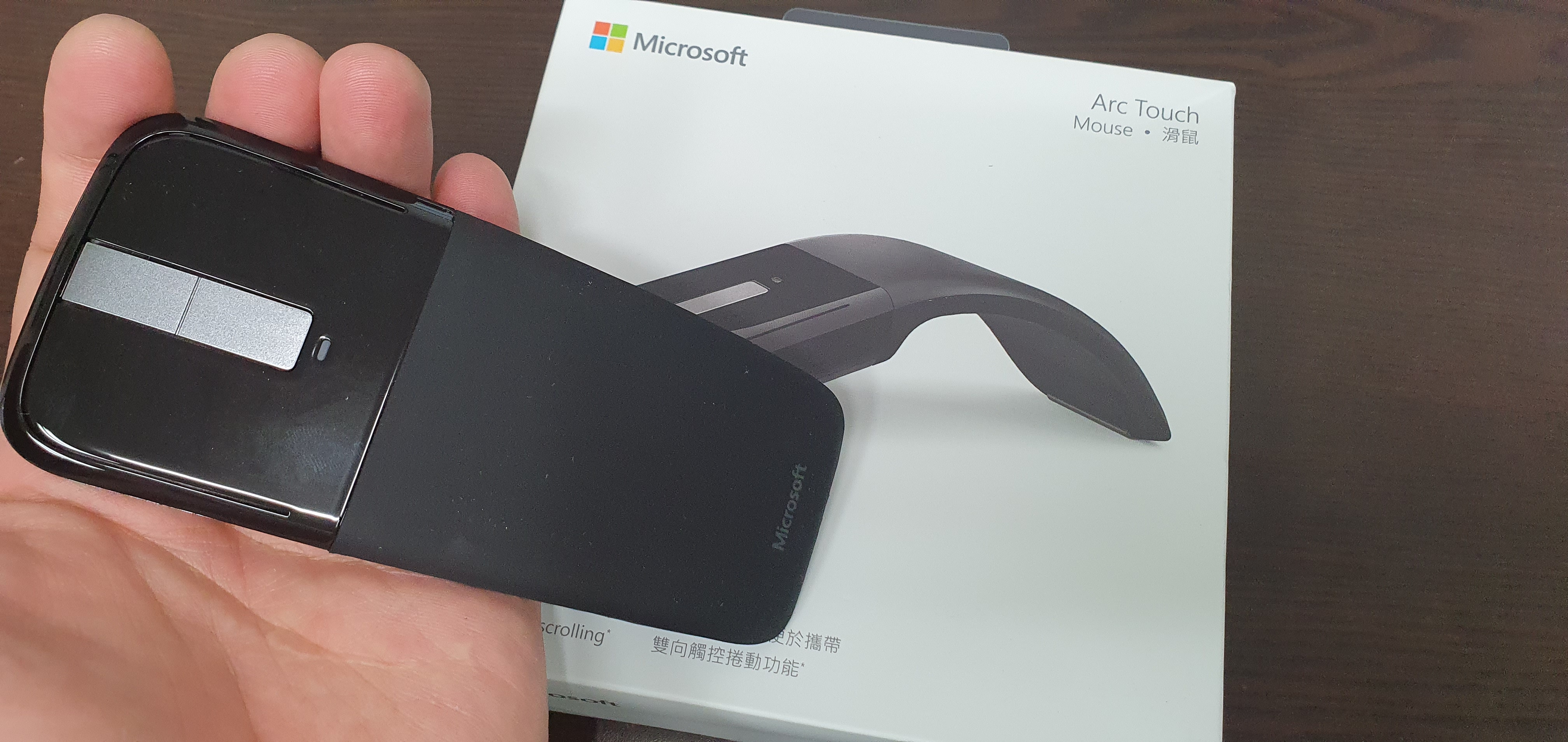 마소의 아크 터치 무선 마우스의 특징중 하나인데 휘어진 모양을 다시 펼 수도 있다. 이렇게 들고 있으면 스타워즈에 광선검으로 변할 것 같기도 하다 이렇게 펴졌다가 휘었다가 할 수 있는 이유가 있는데, 이 마우스에는 전원 버튼이 따로 존재하지 않는다.