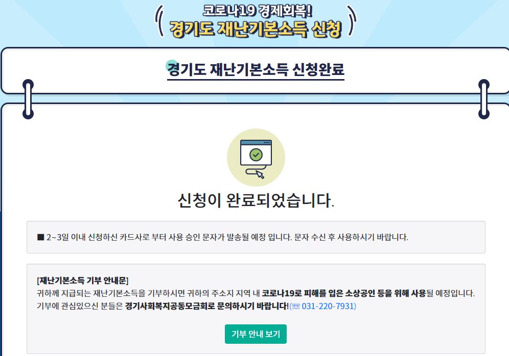 이렇게 간단한 과정을 통해서, 코로나19로 인한 경기도 재난기본소득 신청이 완료되었다. 신청이 완료되면 위와같이, 신청이 완료되었다는 메시지와 함께, 기부안내문도 추가로 볼 수 있다. 기부의 경우는 선택이니, 궁금하신 분만 확인해보시면 될 것 같다.