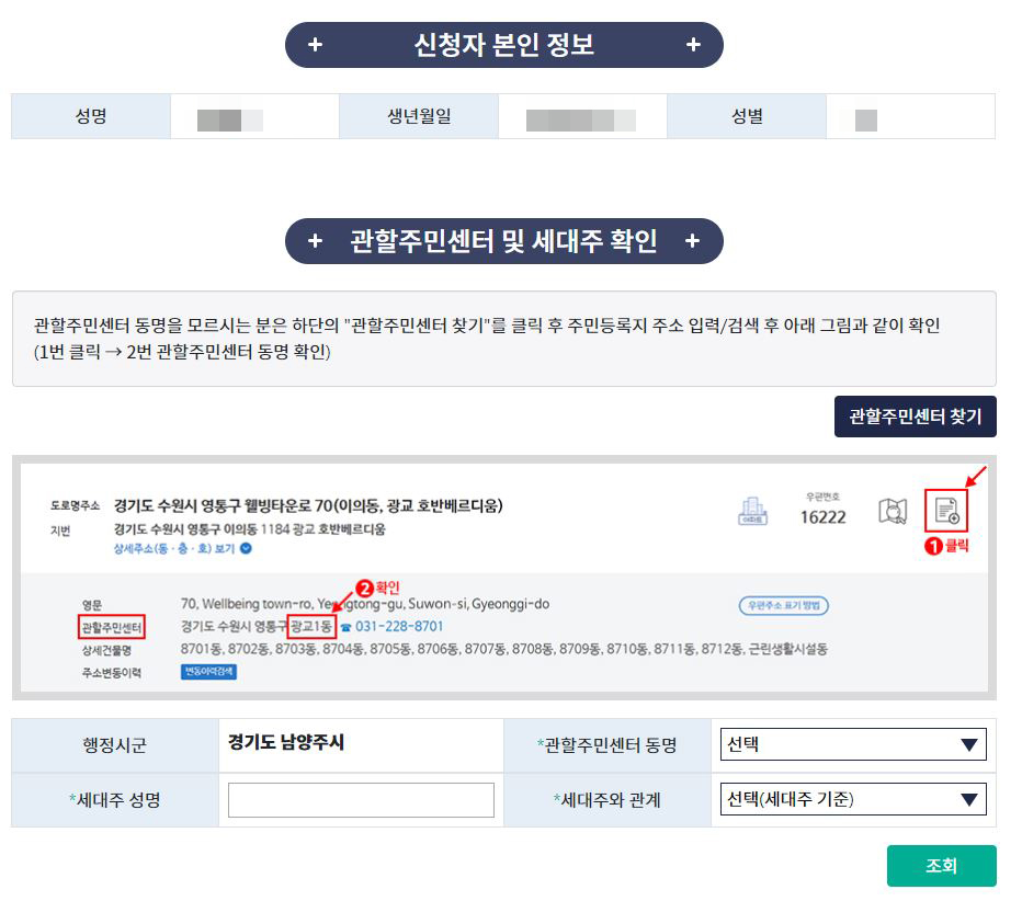 카드사에 등록된 본인 명의에 휴대전화번호로 ARS를 통한 본인 확인이 완료 되었다면 신청자 본인 정보가 자동으로 기재되며 거주하고 있는 관할 지역의 주문센터 동명과 세대주의 이름 및 세대주와의 관계를 선택하여 작성하여 준 후 조회를 눌러 다음화면으로 이동하도록 하면 된다.