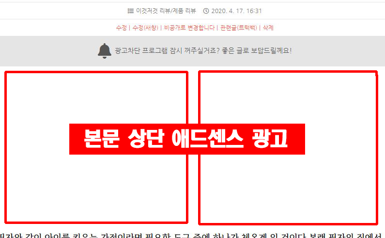 문제점 중 하나는 바로 위와같이, 광고가 표시되어야 할 부분이 가끔 텅 빈 여백으로 표시가 된다는 것이다. 이는 마치 필자가 블로그에 어떤 설정을 제대로 하지 않은 것처럼 보이게도 하고, 블로그 자체에 문제가 있는 것 같이 보이기 때문에, 방문자가 방문하였을 시에 이 블로그는 제대로 관리가 되고 있지 않은 블로그라는 이미지를 각인시켜주기에 딱 좋을 것 같은 모양을 보여주게 되는 크나큰 단점이자 문제점이 될 수 있겠다.