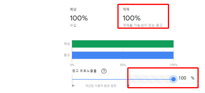 수익창출에 도움이 안 된다고 먼저 이야기하는 이유는 필자의 경험 때문이다. 이는 개개인마다 다른 수 있으니, 무조건이라고는 하지 않겠다. 다만, 필자의 경우, 테스트해 본 결과, 확실히 광고 실적이 우수한 광고를 노출시켜주는 탓에 CPC 금액이 높아서 수익이 마치 괜찮은 것처럼 느껴지기도 한다. 필자의 경우 위처럼 78% 조정하니, 배치해놓은 광고 역역에 전체 100% 광고 중 78%만 노출이 되는 형태였는데, 요점만 따지고 보면 100%나 78%나 수익에 대한 차이는 크게 없다는 것이다.