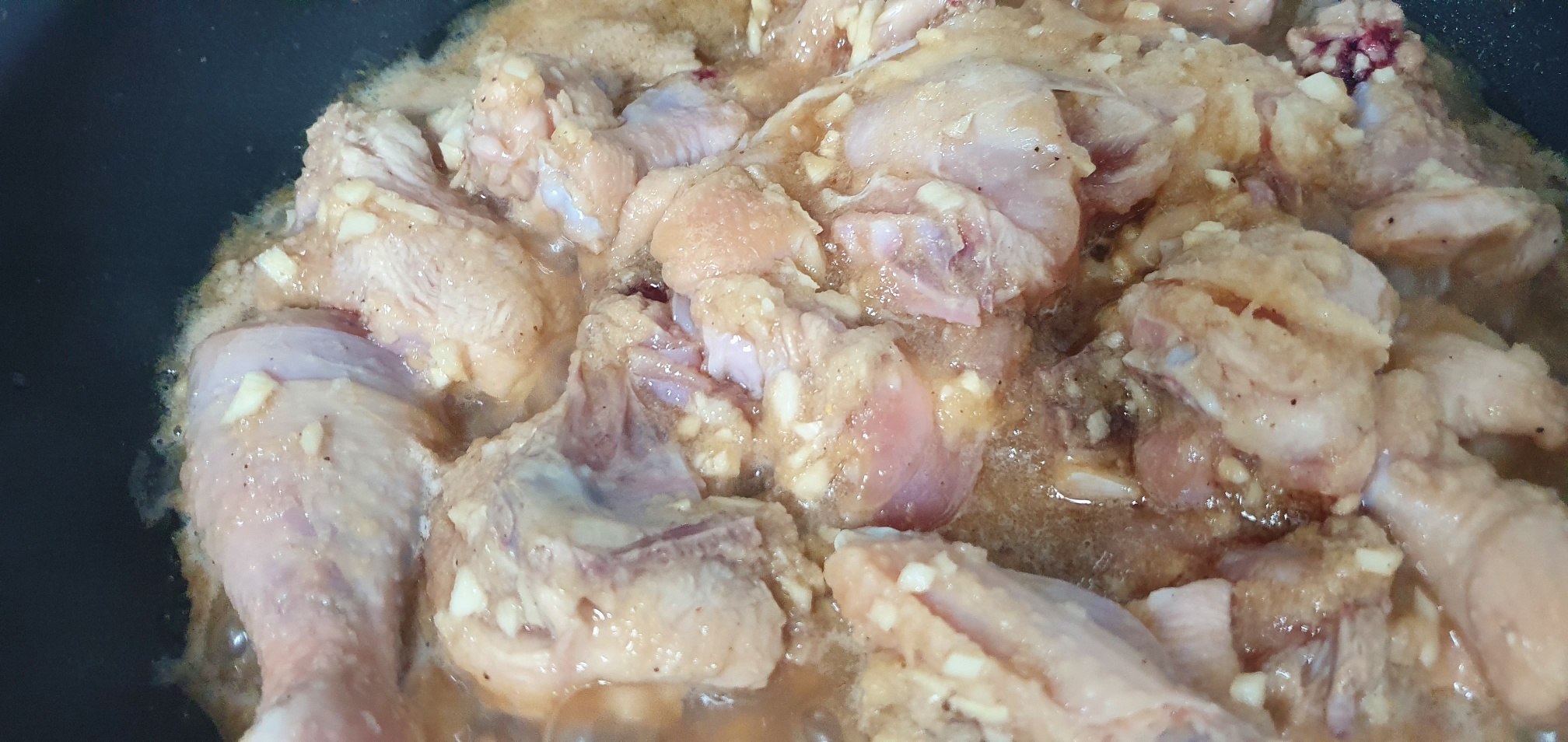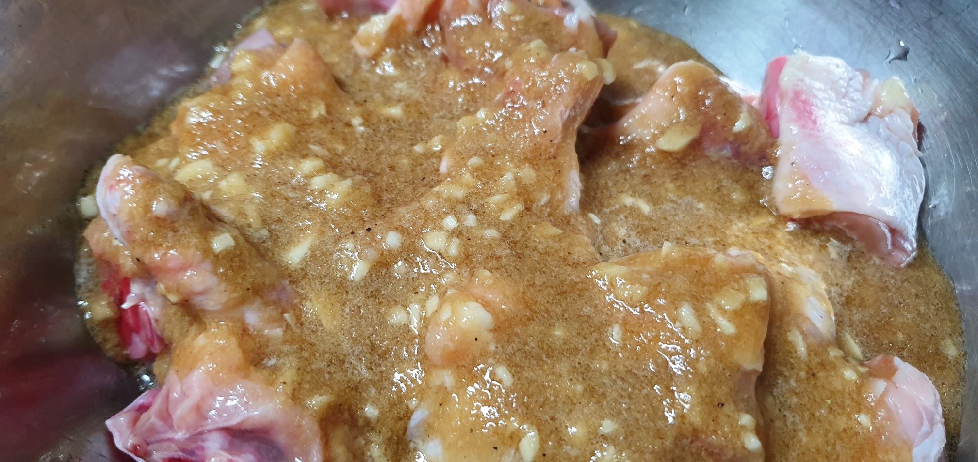 준비한 닭은 마트나 정육점에서 구매할 수 있는 평범함 절단육이다. 뼈가 있는 닭을 선호하지 않는 분들은 절단육 대신, 순살로 된 정육 닭을 구매하면 된다. 구매한 닭을 깨끗한 물로 헹구어 내거나, 닭 비린내를 제거하기 위해, 흰 우유에 잠시 재워둔 후에 씻어내도 좋다. 씻어낸 닭은 채에 받쳐두면 된다