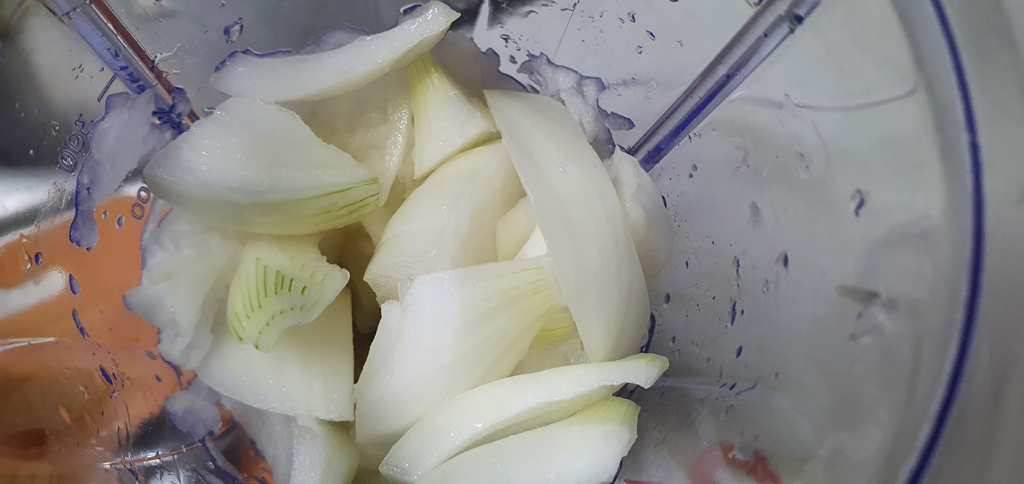 먼저 손질된 생양파 2개를 잘라서 믹서기에 넣어주어야 한다. 양파를 넣었다면 이후 생강술을 3큰술 넣어준다 와이프는 청주 같은 것 대신에 생강술을 넣어주는데 생강술이 없는 분들은 청주를 넣어주어도 된다. 이렇게 한 뒤 믹서를 작동시켜 곱게 갈아주면 된다. 생강술을 어떻게 만들었는지 궁금하다면 아래 생강차 만드는 방법을 참고하도록 하자