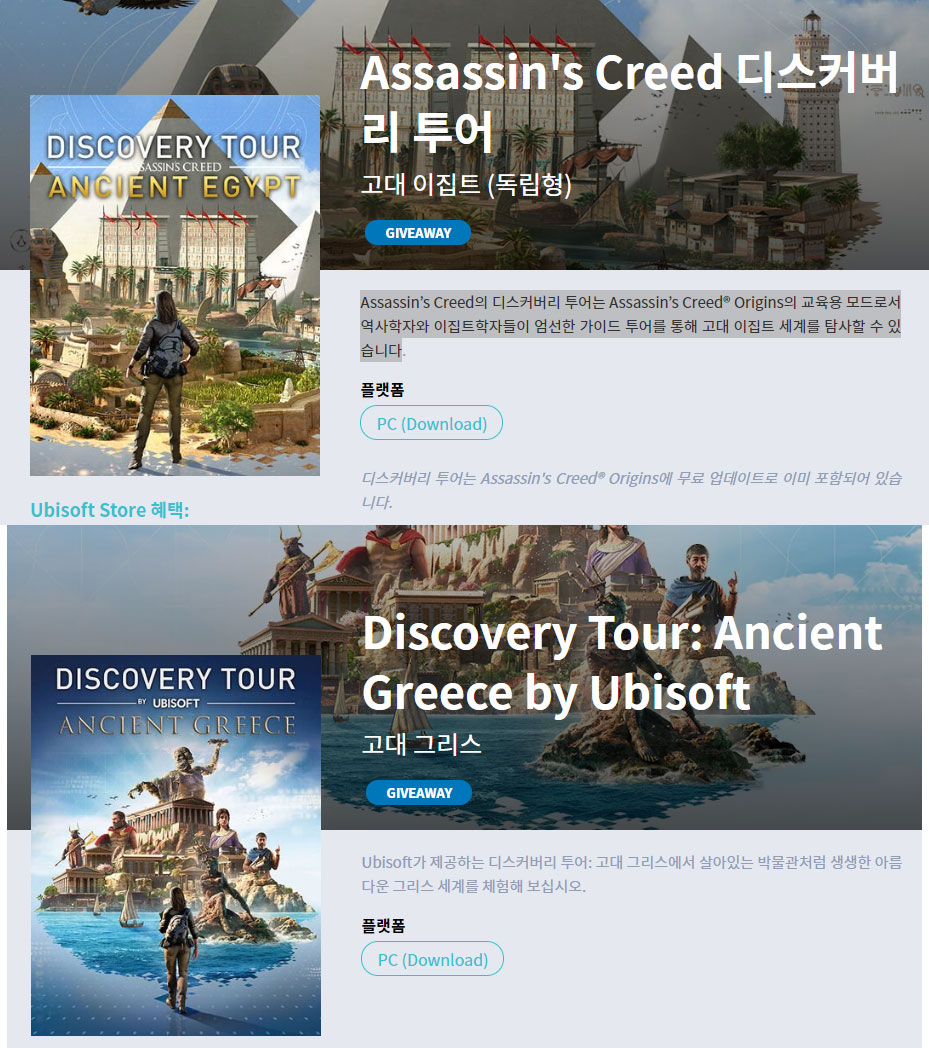 앞서 이야기한 어쌔신 크리드 오리진과 오디세이는 배경이 되는 고대 이집트 및 고대 그래스를 관광하며 탐사해볼 수 있는 교육용 게임으로 이미 오리진 및 오디세이를 소유한 분들에게는 이 콘텐츠가 포함되어있으며 게임을 소유하지 않은 분들은 아래 링크에서 디스커버리 투어 단독 실행판을 무료로 평생 소장 할 수가 있다
