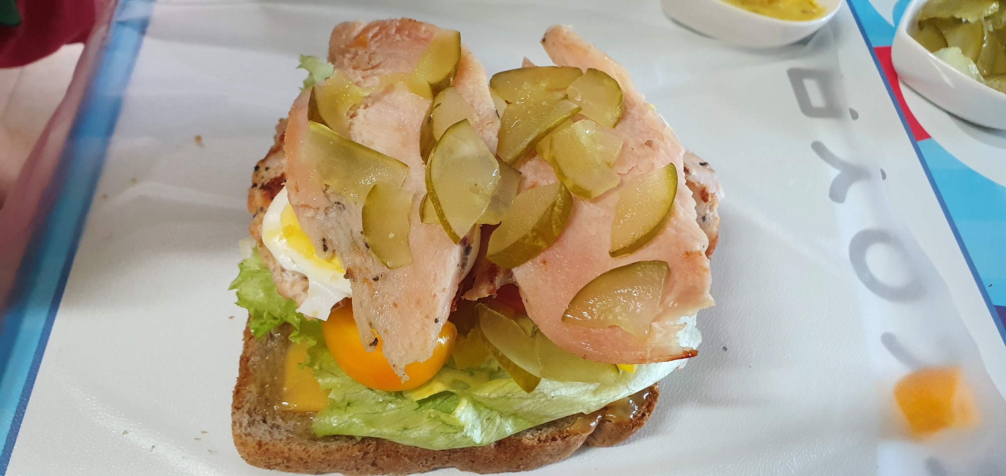 위에서 언급했던 재료들을 하나씩 올려주면 되는데 순서는 관계없으니 본인이 원하는 재료대로 쌓아주면 된다. 키위 소스가 발라진 한쪽 빵에 머스터드소스를 뿌려주고, 양상추와, 파프리카, 오이, 토마토, 삶은 계락 슬라이스 4쪽, 슬라이스 치즈, 닭가슴살, 피클 순으로 올려준 후, 마지막에 상추를 올려주면 샌드위치에 필요한 모드 재료를 올려주게 된 것이다 이제 슬슬 마무리 단계에 왔다