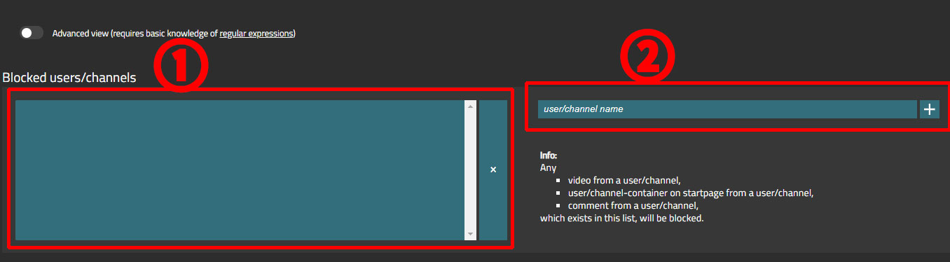 확장 프로그램을 실행하여 보면 위와 같은 화면은 볼 수 있다. 1번에 있는 화면은 블록 시킨 즉 차단시킨 유저나 유튜브 채널의 목록을 볼 수 있는 화면이며, 2번에 있는 것은 직접 차단하고 싶은 유튜브 채널의 채널명 또는 유저 아이디를 추가해서 손수 차단할 수 있는 화면이다. 위 사항이 불편하다면 훨씬 쉽게 사용할 수 있는 방법은 아래와 같다.