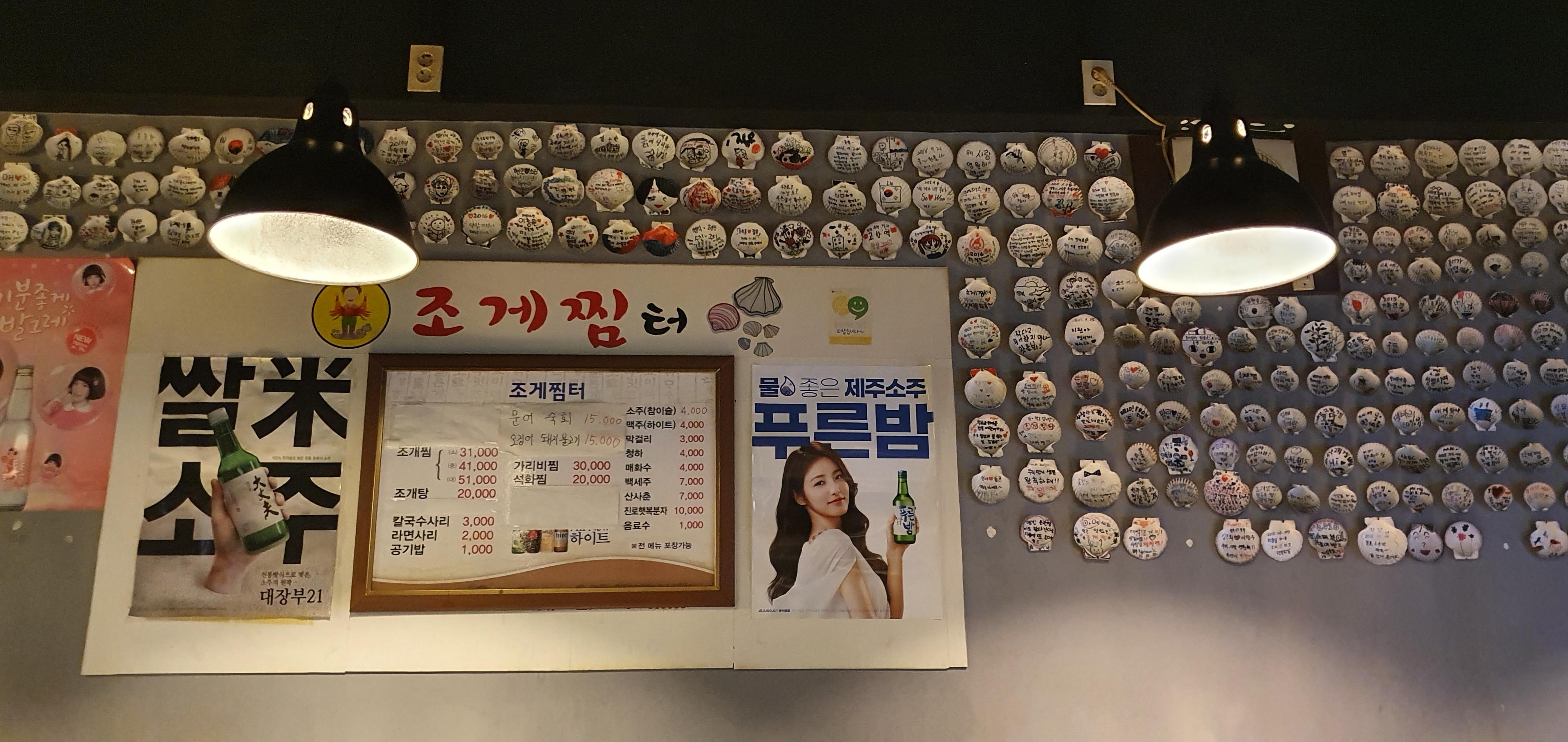 눈에 딱 들어온 조개찜 메뉴 중 대자와 함께 소주를 시키기로 했다. 소주가 먼저 등장했는데 소주가 특이한 게 살얼음들이 안에 둥둥 떠다니는데 한잔 마셔보면 마치 갈아 만든 배 음료를 먹는 것과 같은 느낌을 받을 수 있었다. 아마도 이 집 사장님 만에 특별한 소주 제공 비법이 아닐까 생각한다. 충분히 시그니처라 불려도 무방할 정도이다. 덕분에 아주 쭉쭉 알코올 섭취하는 바람에 부어라 마셔라가 되어버렸다 이 집에 특이점이라면 방문했던 이들이 가리비 껍데기에 글씨를 써서 벽에 기지런히 붙여놓은 것인데 나름 인테리어 효과가 꽤 괜찮았다.