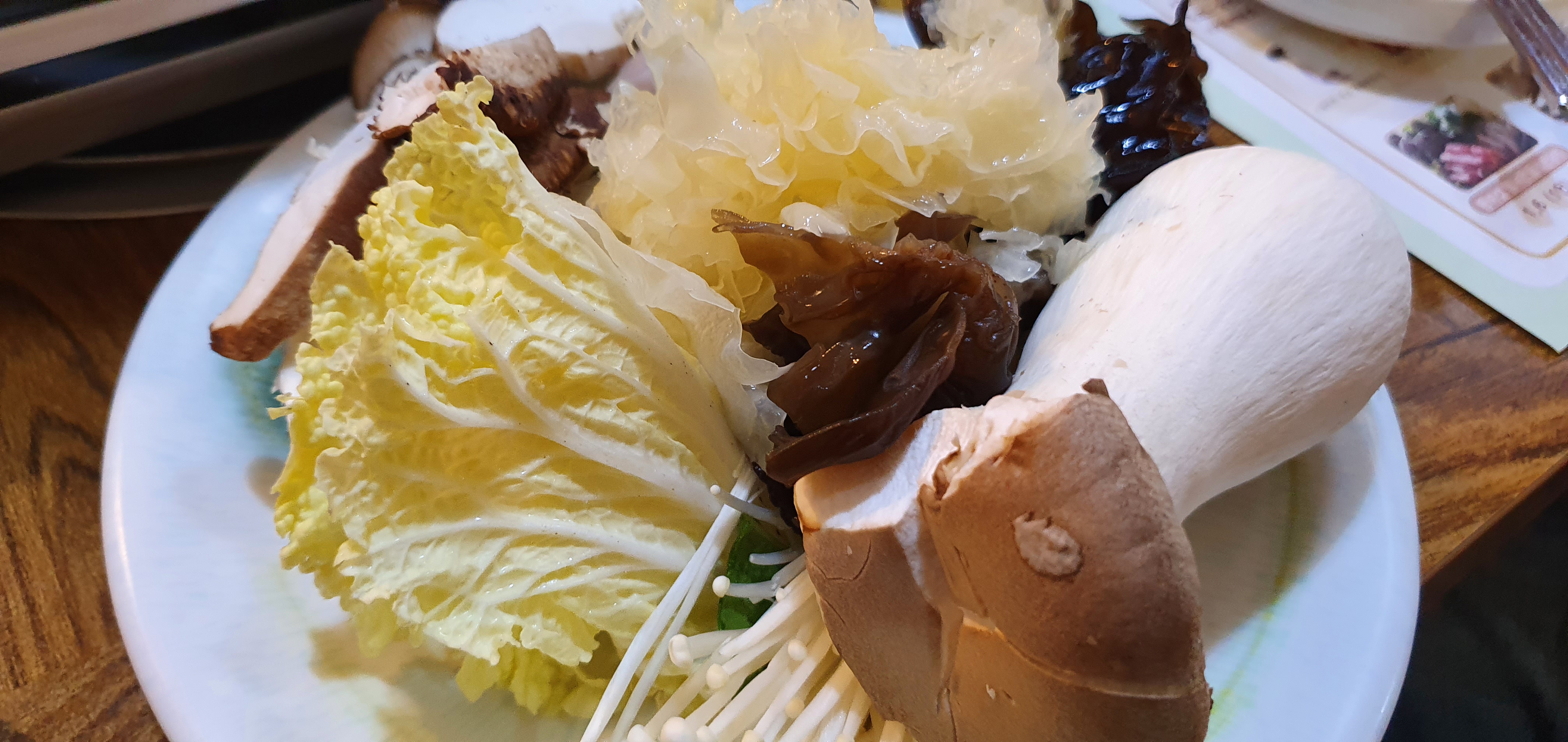우선 홀에 준비된 다양한 반찬과 버섯 등이 준비되어 있는데, 먹고자 하는걸 접시에 담아 오면 된다. 겉절이 김치부터, 장아찌, 비트와 양배추 절임 버섯탕수육, 잡채 등이 준비되어있고 메인 음식인 다양한 버섯도 접시에 담아서 배추와 함께 끓고 있는 육수에 넣어주면 된다. 탱탱하고 쫄깃한 버섯의 식감을 즐길 수 있다. 역시 샤부샤부처럼 즐길 수 있는 전골이다 보니, 고기가 빠질 수 없겠지 소고기도 당연히 넣어서 같이 먹어주면 된다. 이번 포스팅은 길게 말할 것 없으니 잠시 아래와 같이 사진으로 살펴보도록 하자