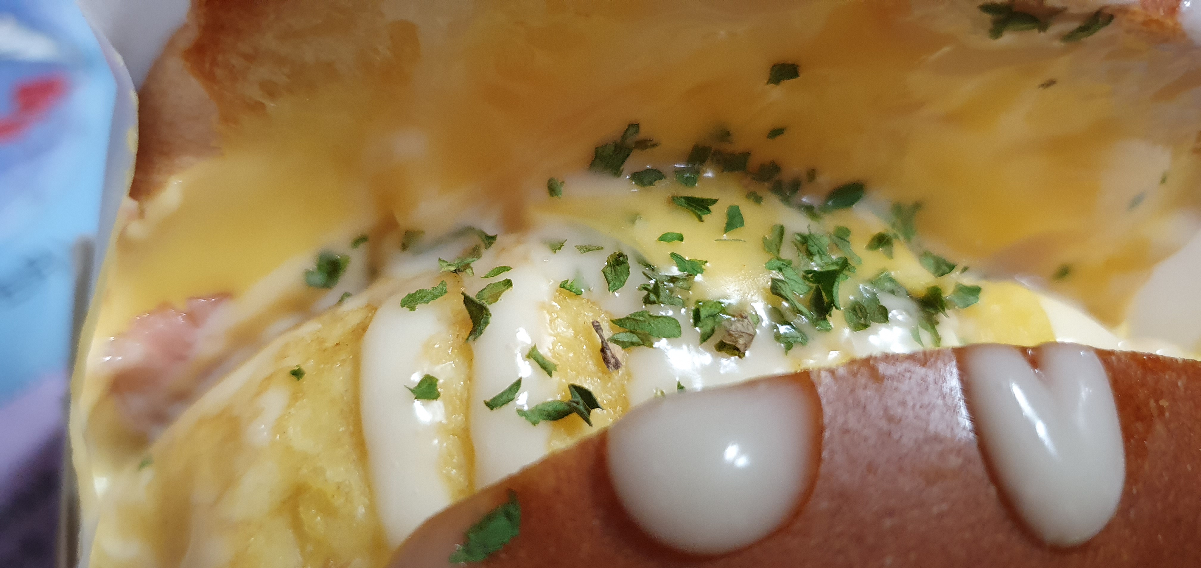 필자는 3종류의 토스트를 구매하였는데 햄&치즈몬 / 베이컨 치즈 몬 / 핫치킨 몬 이렇게 구매하였다. 위 사진처럼 저말 계란이 엄청 두텁게 들어 있고, 보기만 해도 무언가 배부를 것 같은 느낌이다. 눈으로만 봐도 부드러움이 느껴지는 토스트다 일단 비주얼은 합격이다. 토스트는 먹기 편하도록 토스트가 담긴 상자의 중간 부분을 뜯어주면, 윗부분만 떼어낼 수 있게 되어 있어, 깔끔하게 먹을 수 있기 때문에 따로 손에 묻혀가면 먹을 일은 없다.