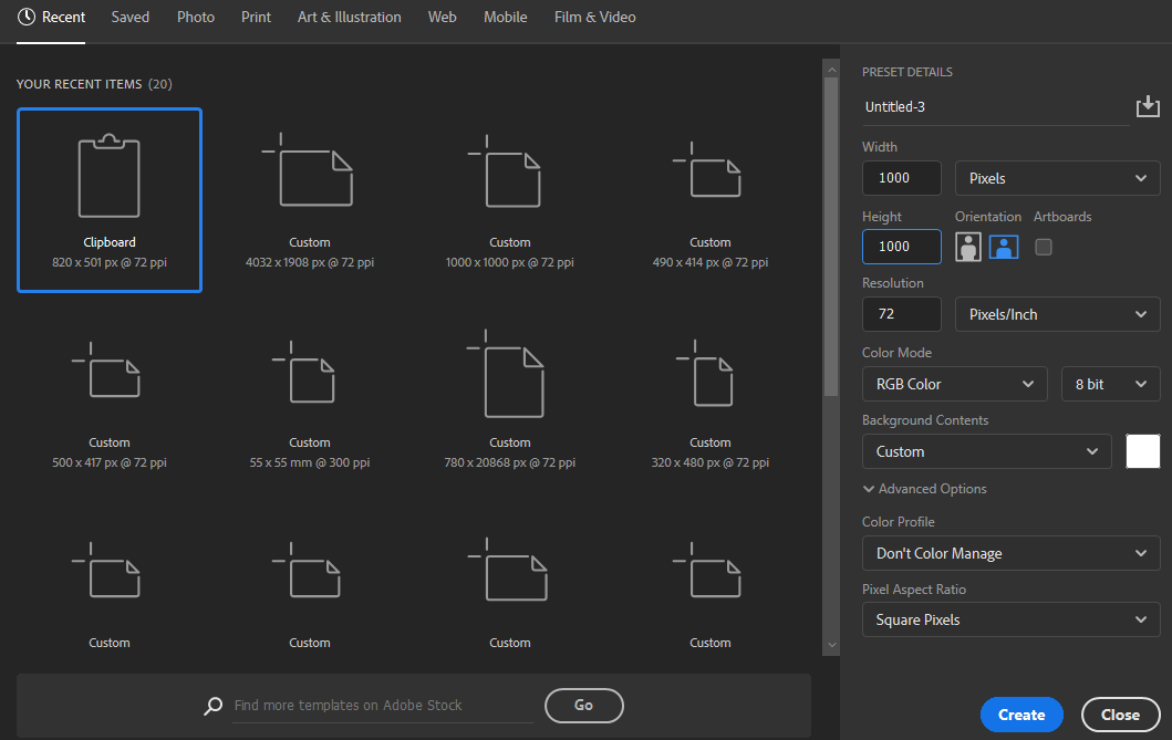 블로그의 대표 사진 겸 썸네일을 만들기 위해서는 원하는 사이즈를 입력하고 새 작업창을 열어주어야 한다. 포토샵을 열고 Ctrl+N 을 누르면 위와 같은 화면이 나타나고, 가로와 세로 사이즈를 입력하여 준 후 Create 버튼을 눌러주면 된다. 블로그의 경우 가끔 세로 사이즈의 썸네일을 사용하는 블로그도 있지만, 대부분 정사각형 형태의 썸네일을 사용하고 있으니, 본인 블로그에 맞는 사이즈로 입력하여주면 된다. 필자는 1000px X 1000px의 사이즈로 작업창을 만들었다.