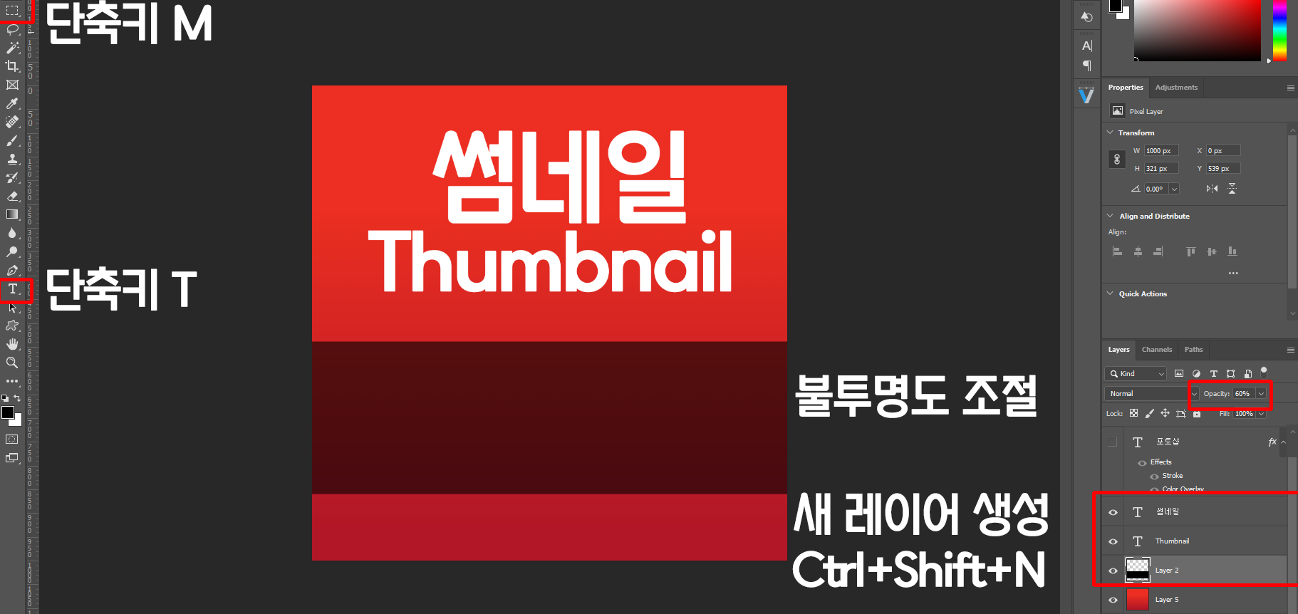 위 사진과 같이 먼저 새로운 레이어를 생성해준 후 단축키 M 마퀴 툴을 사용하여 글씨가 쓰일 공간을 사각형으로 그려주고 현재의 전경 색으로 채워준다 포토샵 왼쪽 패널을 보면 전경색이 현재 검은색으로 되어 있기 때문에 검은색으로 채워지게 된다. 전경색 채우기 단축키는 Alt+Enter이다. 이후 새로운 레이어가 선택된 상태에서 불투명도를 조절하여 준다 필자는 60%로 조정해 주었다. 불투명도 조절이 되면 위와 같이, 배경인 그라데이션이 비춰지기 때문에, 색이 겹쳐지는 현상을 위와같이 확인할 수 있다. 다음 밋밋한 배경에 글쓰를 작성해주면 되는데 필자는 위와같이 썸네일 Thumbnail이라고 적어주었다 텍스트는 단축키 T를 누른 후 작업화면에 마우스 클릭 후 작성하여주면 되며, 크기는 앞서 이야기한 대로 Ctrl+T를 이용해서 크기를 조절하여주고 선택 툴을 (단축키 V) 이용하여 위치를 맞추어 주면 된다.