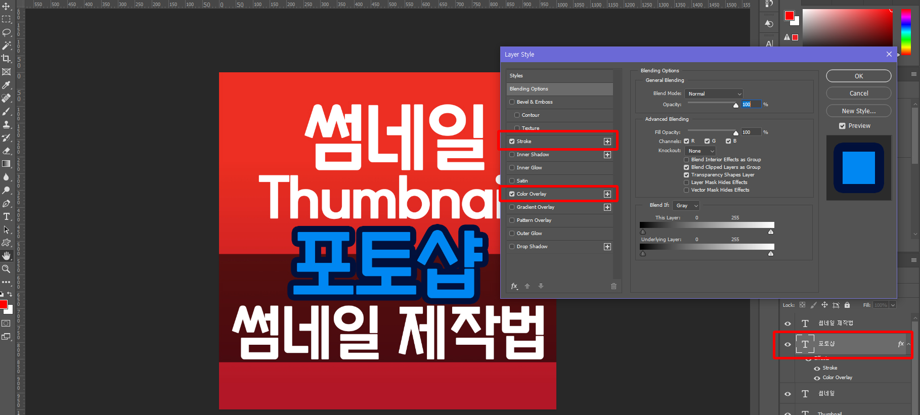 위 작업에서와 동일하게, 글씨를 적어준다. 필자는 포토샵이라는 글씨와 썸네일 제작법이라는 글씨를 각각 작성하여, 크기 조절 후 위와 같이 배치하였다. 하얀색의 글씨만 있는 것이 밋밋해 보여, 위와 같이 레이어 스타일을 통해 글씨에 효과를 부여해줄 수 있다. 스타일을 변경하고자 하는 텍스트 레이어의 마우스 더블클릭하면 위와 같이 레이어 스타일을 지정할 수 있는 화면을 띄울 수 있다. 여기에서 필자가 선택한 스타일은 Stroke와 Color Overlay 두 가지이다. 각각 선택하여, 색상을 원하는 색을 지정하여주면 되며, Stroke는 외곽선의 두께 사이즈를 변경하여 줄 수 있다.