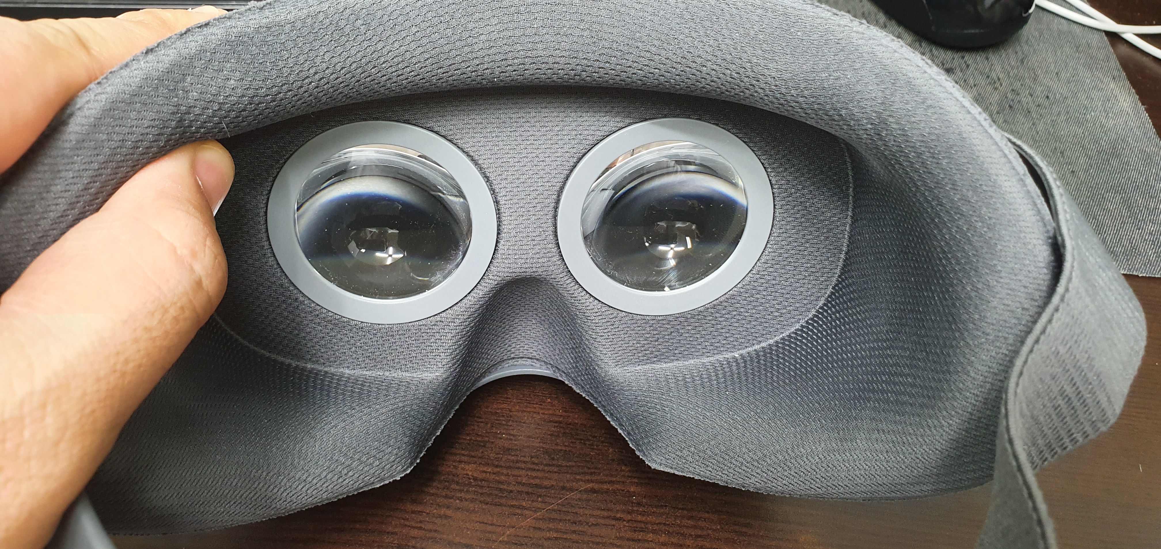 사용하고 있는 휴대폰에서 VR앱을 실행시킨 뒤에 보시는 바와 같이, VR헤드셋 앞쪽을 열어 주면 위와 같은 모습을 볼 수 있다. 저 부분에 VR앱 실행 화면을 볼 수 있도록 가로형태로 스마트폰을 장착하여 준다음 뚜껑을 닫아 윗 고리에 채워주면 끝이다