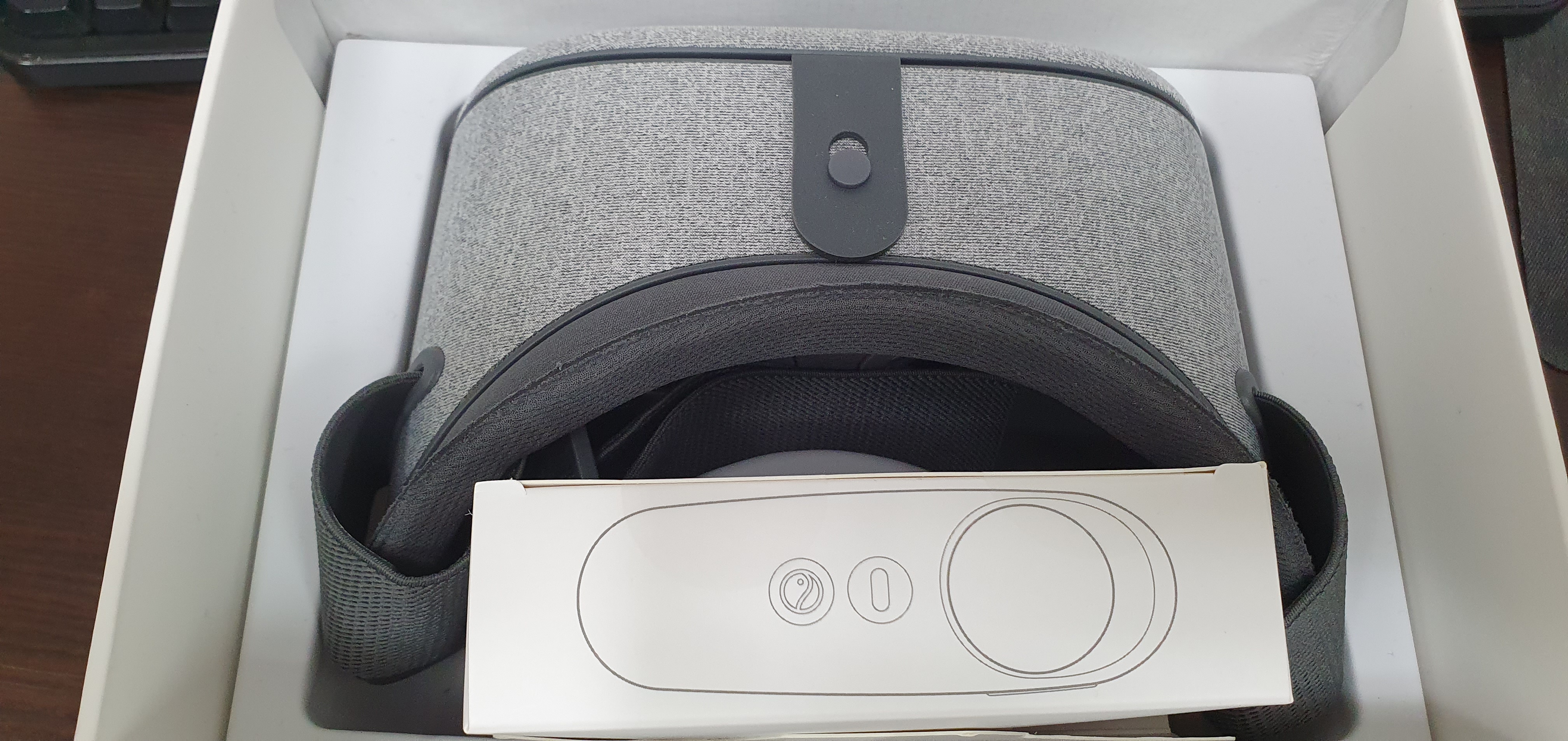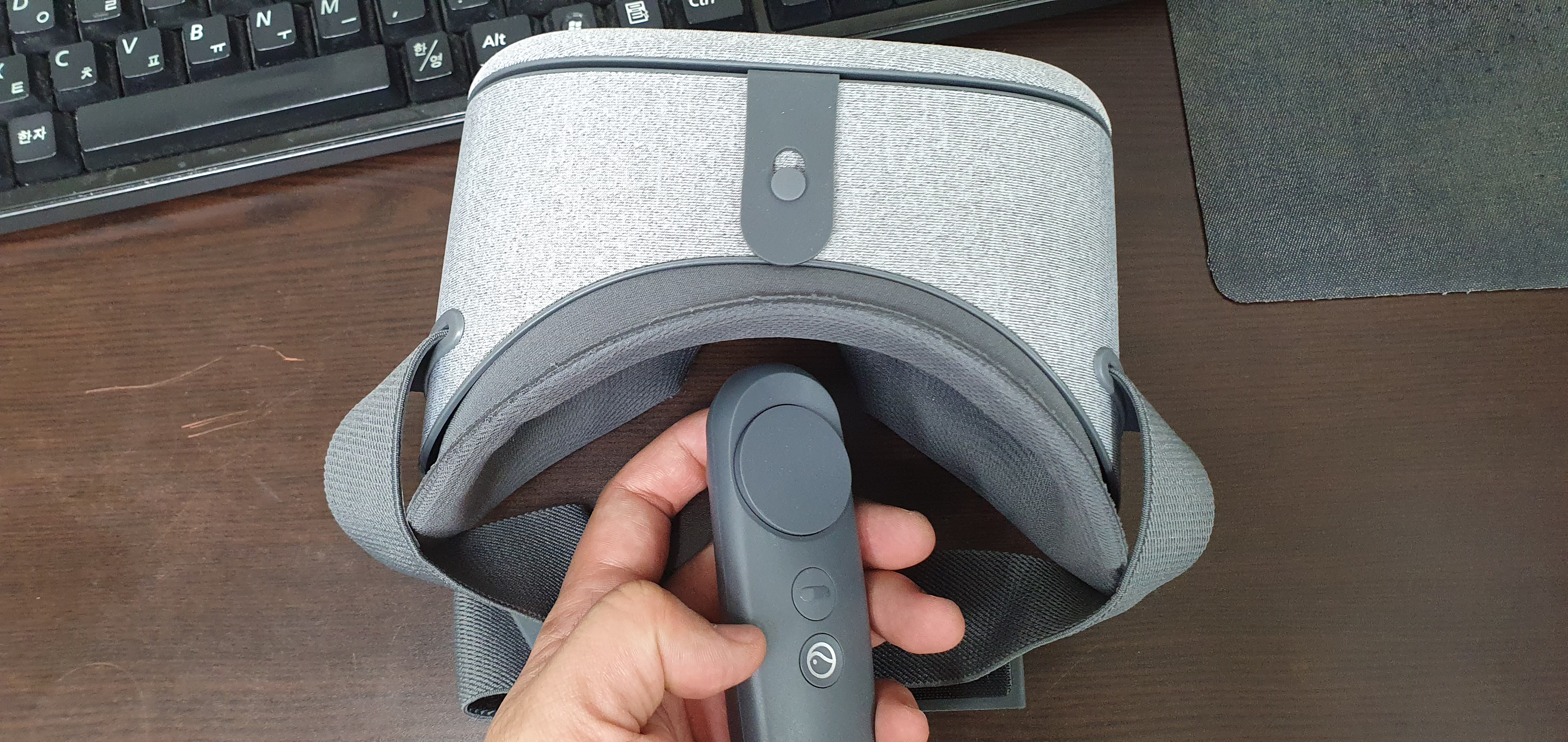 휴대폰을 장착하고 머리에 장착할 수 있는 VR해드셋과 VR 공간 안에서 움직임을 제어하거나 선택할 수 있는 컨트롤러 그리고 사용설명서가 전부다. 너무 간단해서 설명할 것이 따로 없다. 짝히 전원이 들어가는 것도 아니기 때문에, 컨트롤러에 건전지만 장착하여 주면 바로 사용이 가능하다