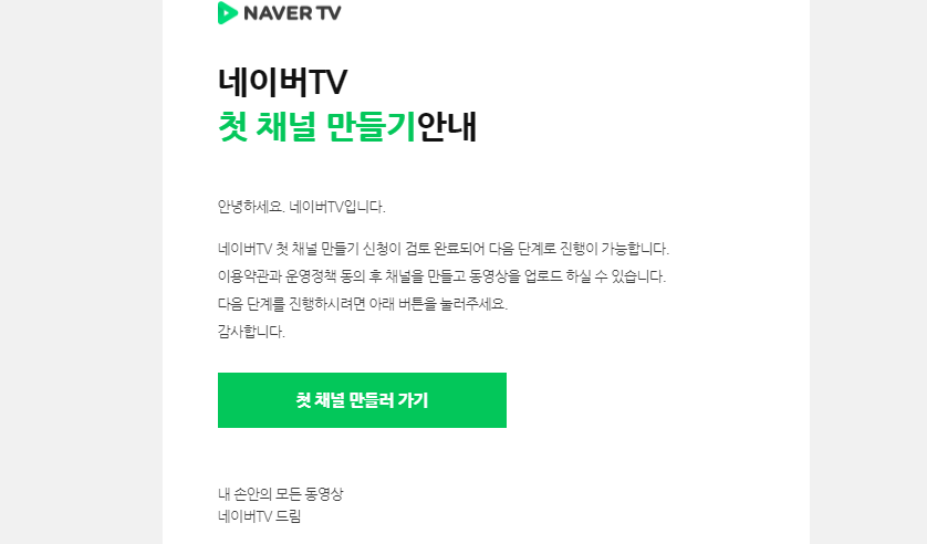 여러분도 혹시나 네이버TV 채널을 신청하신 분들이 있다면 신청 후 며칠 뒤면 위와 같은 이메일 한통을 받아 보실 수 있을 것이다. 신청 검토가 완료되어, 첫 채널을 만들어보라는 메일이며, 네이버 TV로 이동하여, 채널에 맞는 이미지와 로고 등을 제작하여 업로드하고, 소개 등을 작성한 후 , 제작된 영상을 업로드하여주면 끝이다. 기본적으로, 운영하는 방법이 까다로운 것이 없기 때문에, 영상을 통한 콘텐츠를 제작하는 분들이라면 네이버 TV를 활용해보는 것도 나쁘지 않은 선택인 것 같다. 끝.