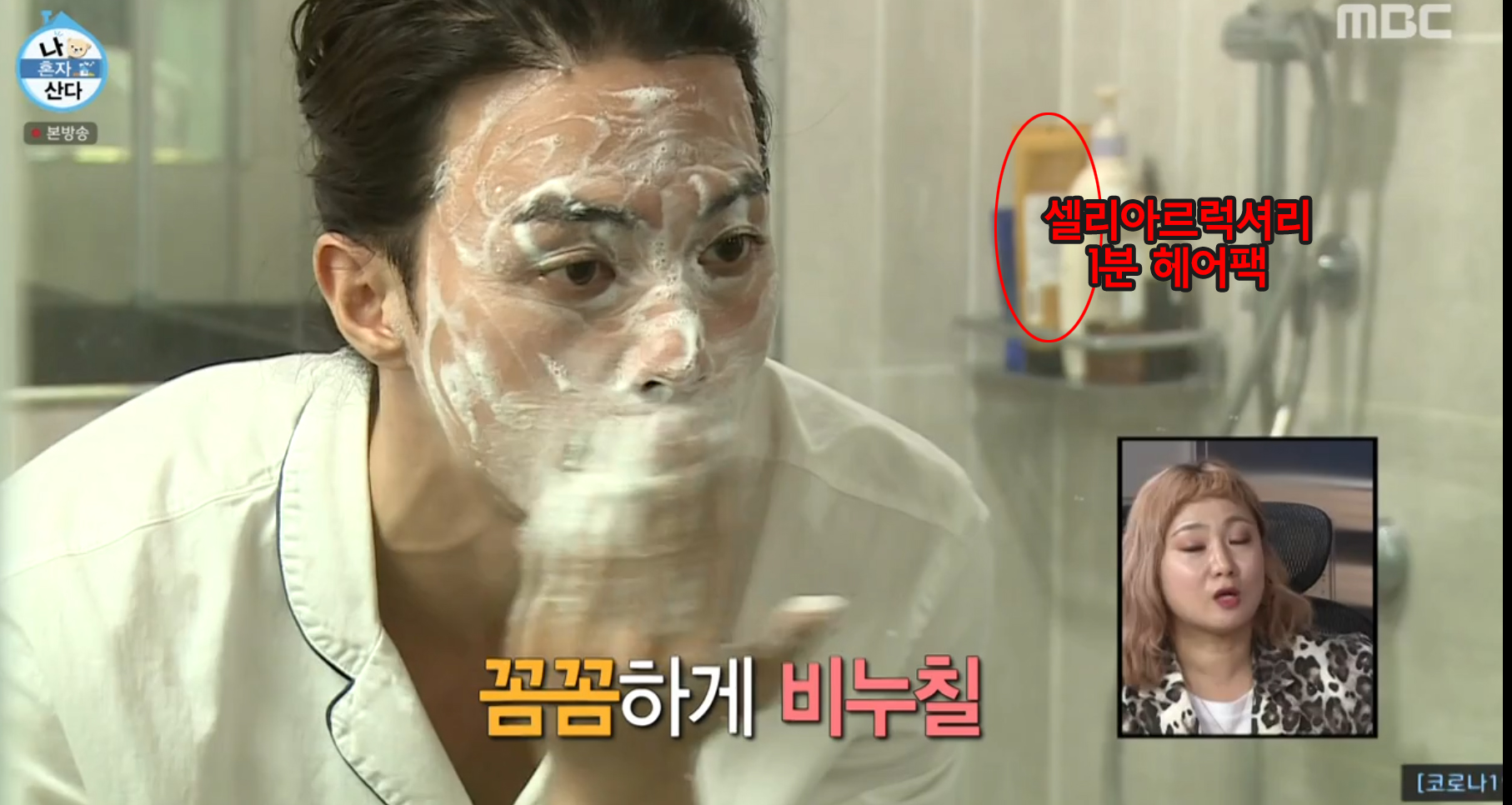 필자가 사용하는 헤어팩이라서, 위 캡처본과 같이, 뿌옇게 블러 처리가 되어있어도 모양이나 색상만 보아도 단번에 알아차릴 수 있었다. 더군다나 필자가 집 욕실에 비치한 위치까지 동일해서 100% 내가 사용하는 것과 같은 제품이라 생각했다. 저런 색상과 모양 제품은 럭셔리 제품 말고 본 적이 없어서 인 것 같기도 하다. 아쉽게도 방송에서 해당 제품을 사용하는 장면은 나오지 않았지만, 필자의 경우 앞서 이야기한 대로 머리를 감고 물기만 제거하고 헤어팩 바른 후 세안과 면도를 하고 나서 한 번에 씻어 내는 편이다. 제품 명처럼 1분도 안 되는 시간에 머릿결이 달라지는 걸 느낄 수 있어서, 자주 사용하는 편이다.