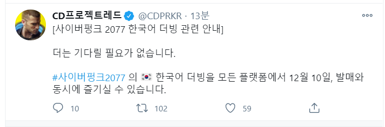 본래 사이버펑크 2077의 출시일은 12월 10일이고, 한국어 더빙은 12월 11일부터 즐길 수 있다고, 소식통이 있어서 그렇게만 알고 있었는데, 공식 트위터를 통해서, 12월 10일 출시 당일부터, 한국어 더빙으로 출시와 동시에 즐겨 볼 수 있다고 밝혔다 아래는 공식 트위터를 통해서 밝힌 내용이다. 여간 반가운 소식이 아닐 수 없다!