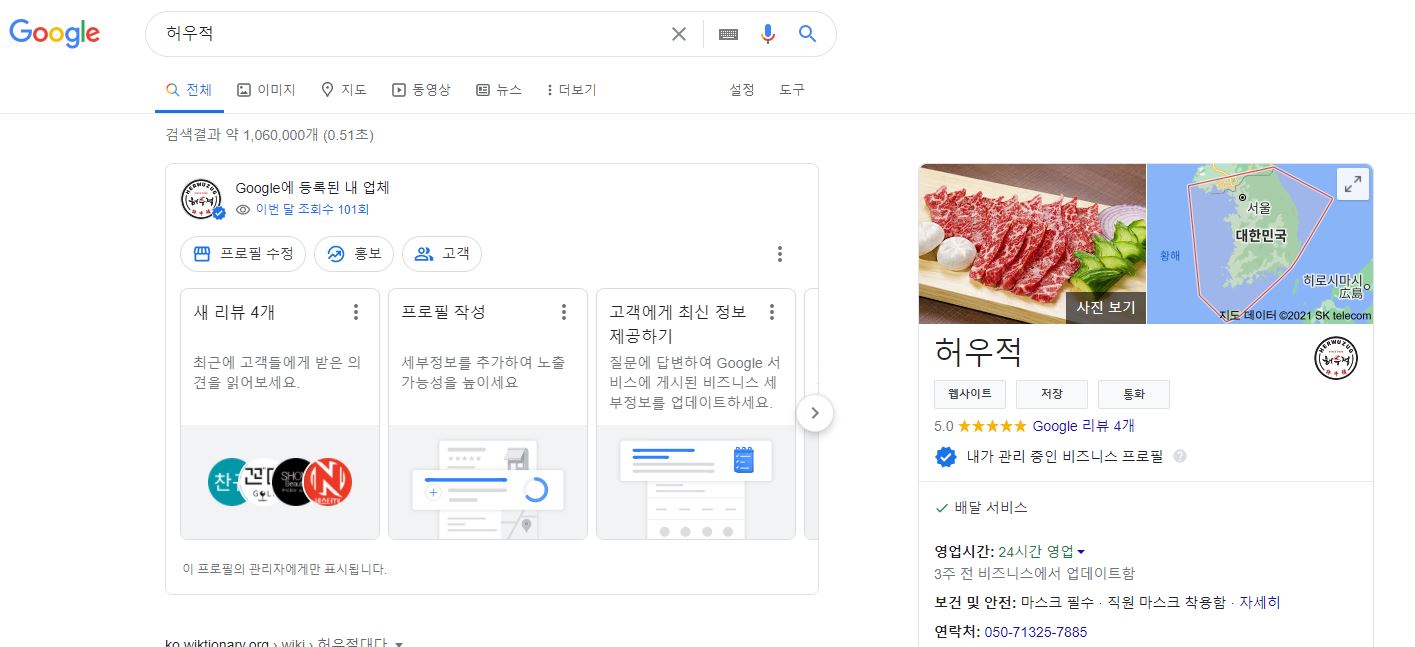 필자가 운영하는 한우 쇼핑몰 허우적도 위와 같이, 구글 검색창에 검색하면 화면 우측에 노출되고 구글 지도 서비스에도 노출되는 것을 확인할 수 있다. 여러분도 만일 온오프라인에 상점을 운영하고 있고, 아직 이러한 서비스를 모르고 계셨다면 진행해보시길 바란다. 그리고, 허우적 한우 쇼핑몰에서 진정한 1++ 등급의 한우를 만나보도록 하자 끝.