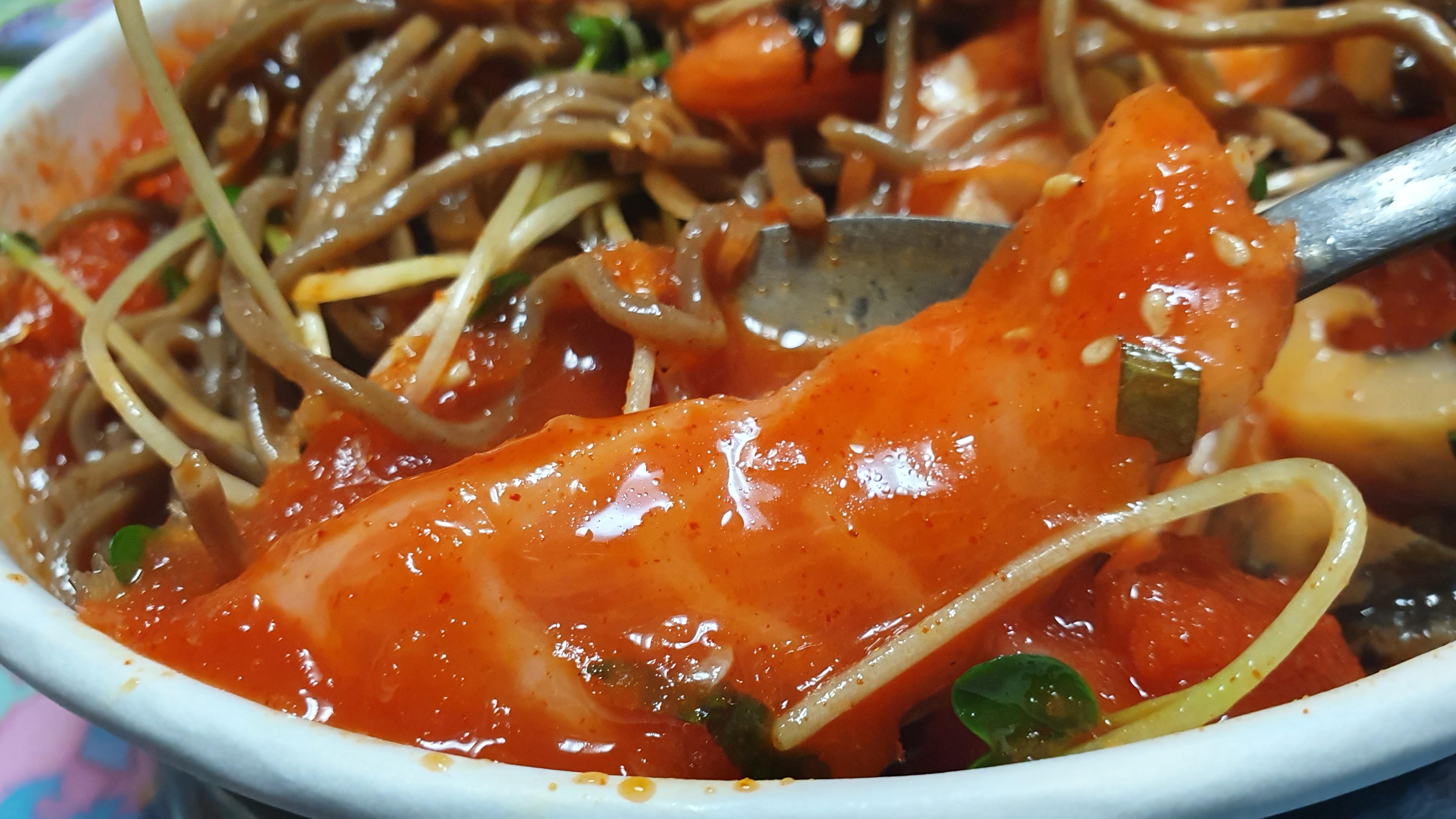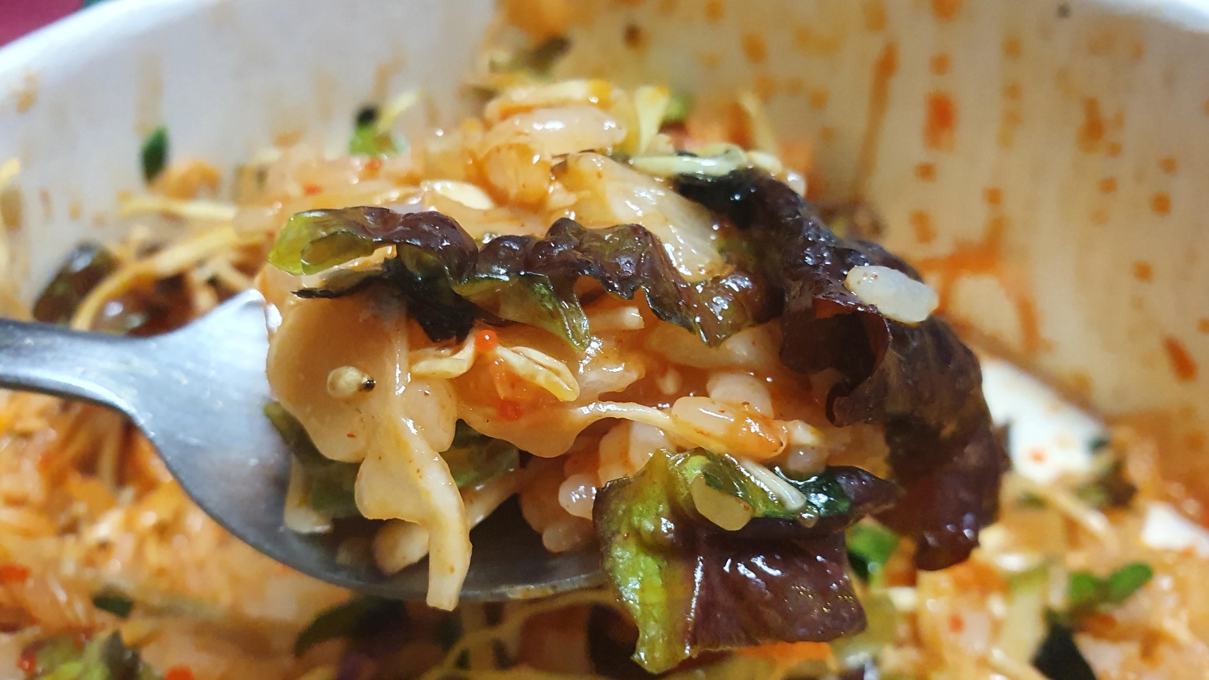 따로 포장된 비빔소스를 전부 부어주고, 그릇 밑에 깔려있는 밥과 야채 및 회를 골고루 숟가락을 이용해서, 쓱싹쓱싹 비벼주면, 맛있는 회덮밥이 완성된다. 한 끼로 훌륭한 밥상이 된다. 소스가 뭔가 계속 당기는 맛이 나서, 한 숟갈씩 먹다가 보면 금세 바닥이 나는데, 배부르면서도 더 먹고 싶은 마음이 생겨 아쉽다. 하지만 우리에겐 물회가 있지.