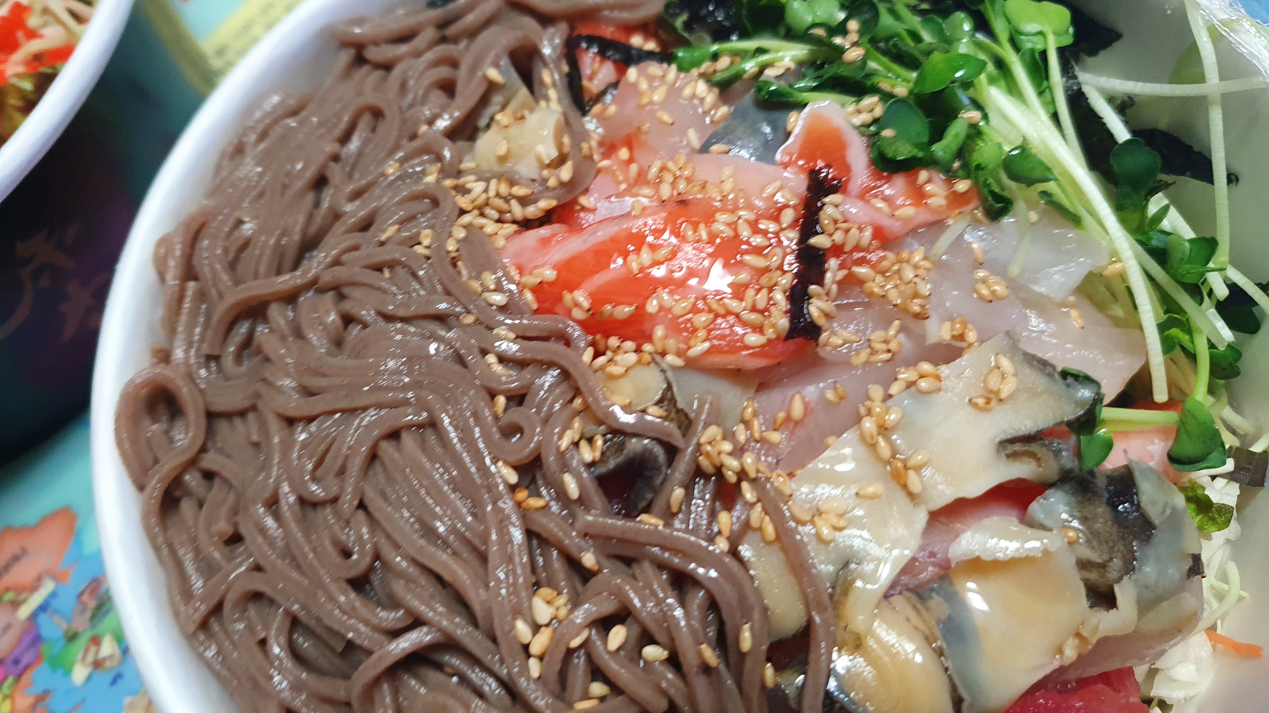 추운 날씨에 차가운 물회라니 이게 어울립니까 라고 반문하시는 분들이 계실지도 모르겠으나, 시원할 때에는 시원한 걸 먹는 게 뭔가 더 좋다. 사실 냉면도 여름에 먹는 음식이 아니라 실은 겨울 음식이라는 것처럼 말이다. 별내 스시혼에 물회는 물회 육수가 정말 맛이 좋다. 새콤 달콤하면서 매콤한 맛까지, 굉장히 중독적인 맛이고, 썰어진 횟감 들도, 통통하고 신선한 것들이 들어가 있어, 술을 절로 부르는 메뉴다. 우선, 삶아진 메밀면을 시작으로 흡입해주면 된다.