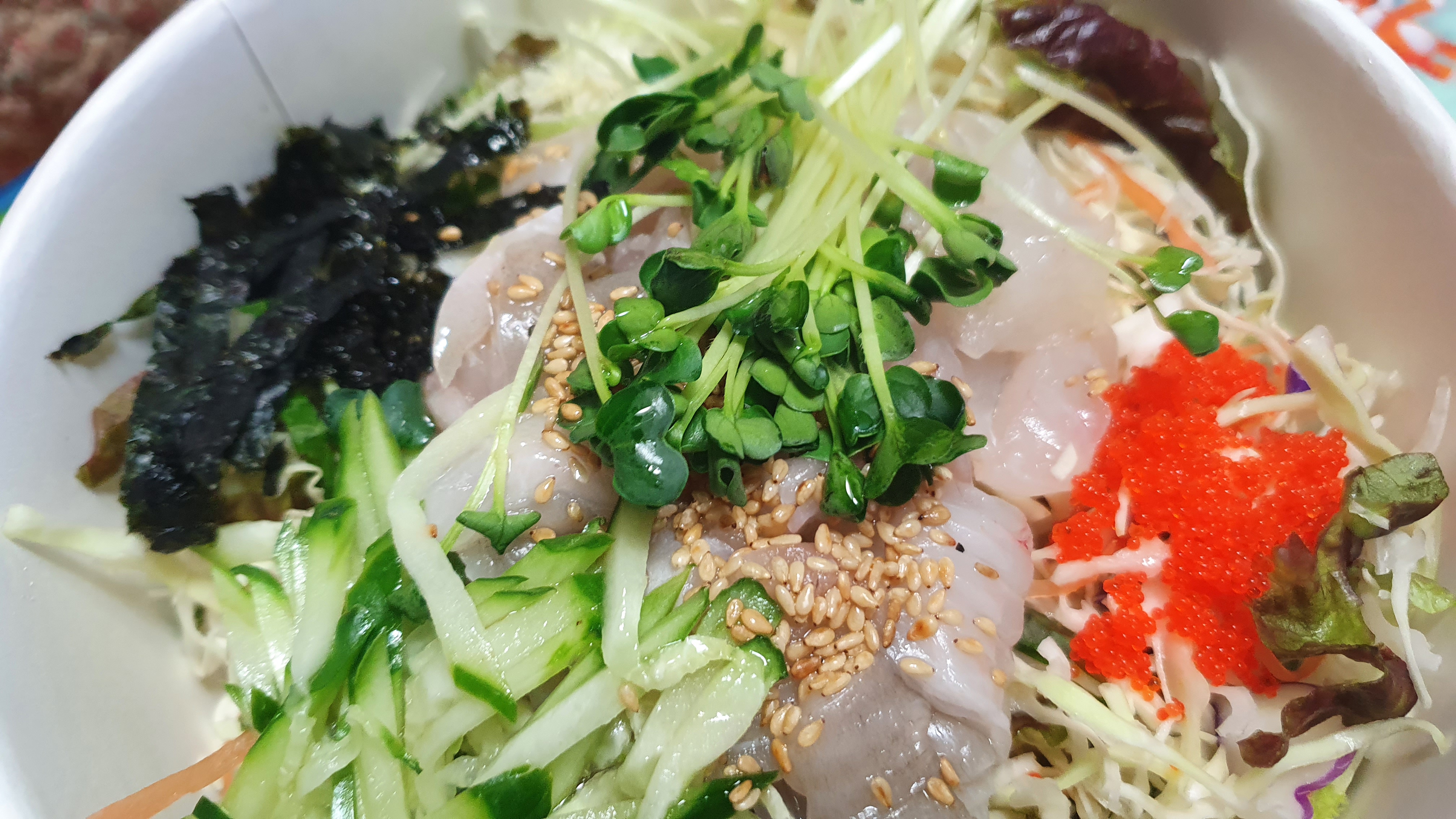 아직 육수를 붓지 않은 물회와 비빔소스를 넣기 전에 회덮밥 형태다. 역시나 궂은 날씨를 헤치고 달려온 보람이 있다 횟감의 살을 통통해서, 씹는 느낌이 좋고, 야채와 회가 많이 들어 있어서 넉넉하고 배부르게 먹을 수 있다. 물회는 양이 많아서, 한 번에 다 먹기에는 사실 역부족이다. 물론 양이 크신 분들이라면 원큐에 끝낼 수도 있다.