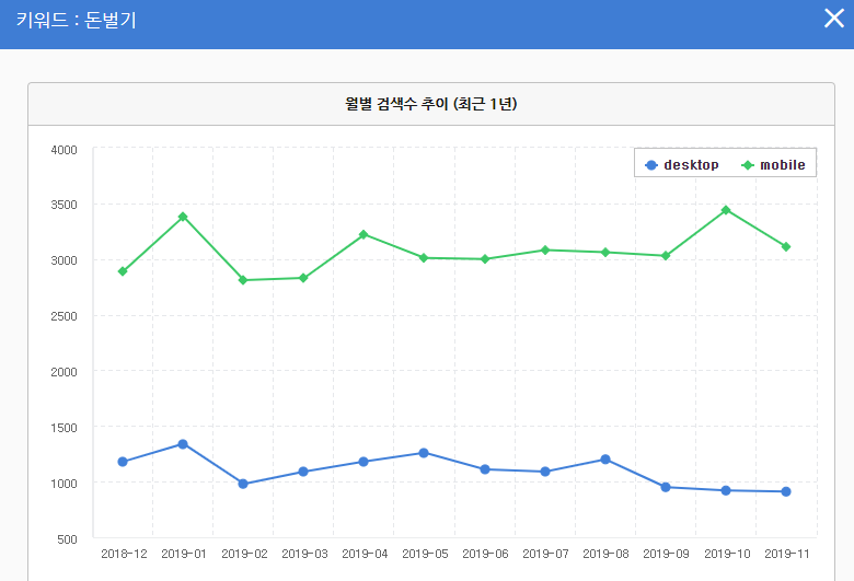 또한, 광고시스템에서 가령 돈벌기라는 키워드를 월별 검색 수 추이로 살펴본다면