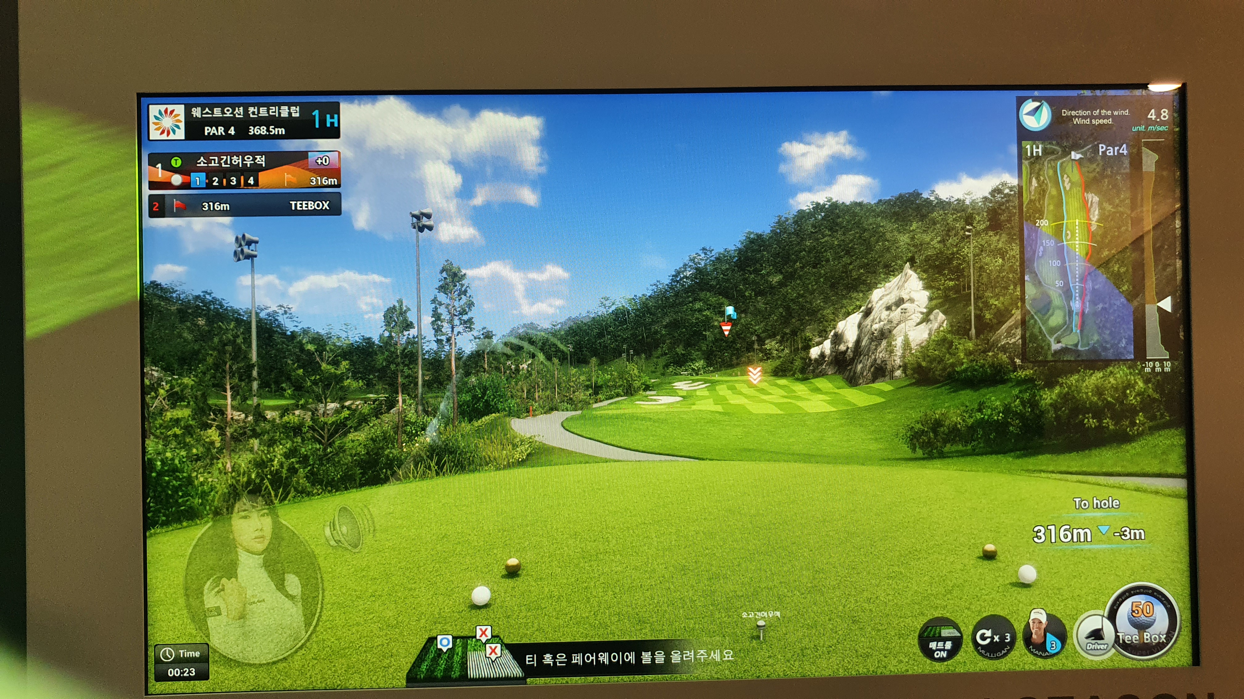 정말 필드에서 라운딩 하는 느낌을 제대로 스크린을 통해 체험할 수 있다. 벙커나 러프에서 빠져나오는 것 역시, 경사도에 따라, 진짜 필드에서 치는 것처럼 제대로 쳐내지 않으면 정말 늪에 빠진 것과 같은 죽을 맛을 경험할 수 있다. 그린에 느낌 또한, 실제 퍼팅을 했을 때 공이 굴러가는 느낌을 잘 전달받았다. 골프존이나, 프렌즈가 완전히 게임으로 보였을 정도이니 말이다