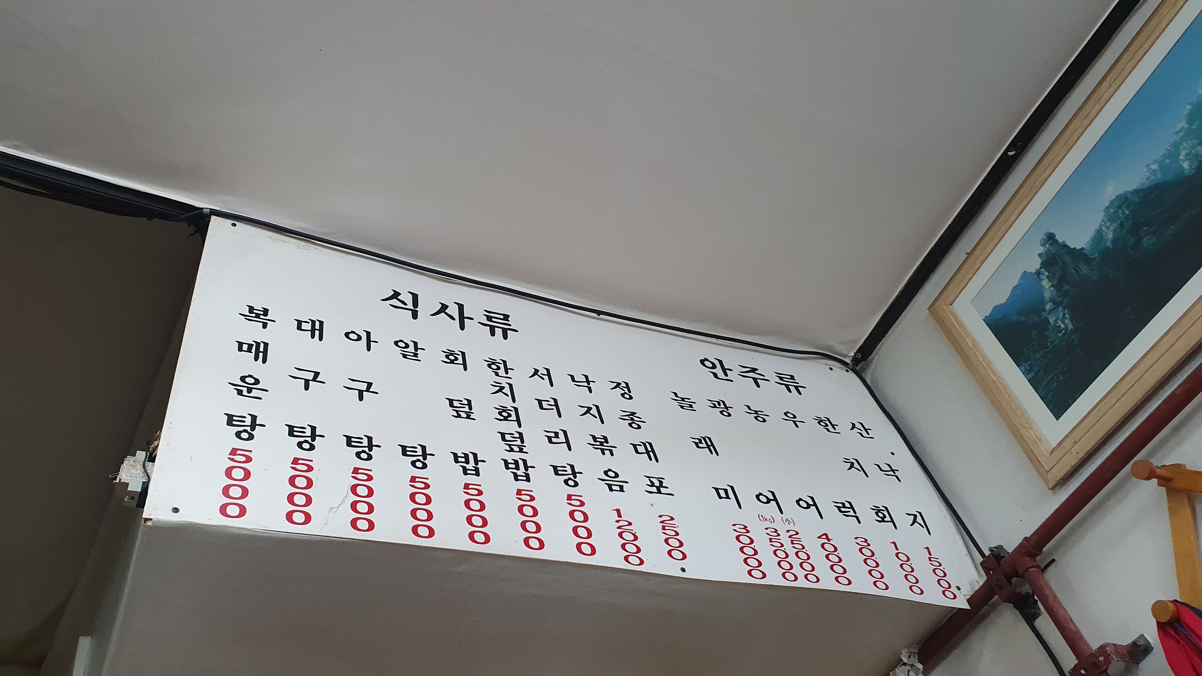 가게에 들어서자마자 정면에 보이는것이 바로 위 메뉴판이다. 위에 작성된 메뉴 외에도 다른 메뉴도 준비되어 있다. 우선 가격만 보아도 식사류가 5천원에 통일되어 있다는 걸 알 수 있고, 안주류 역시 가격이 아주 착하다 가격만 싸고 양이 적고 맛은 그럭저런것 아닌가라는 의심을 하시는 분들이 있을 수 있겠지만, 먹어보지 않고 감히 그런말을 한다면 굉장히 곤란하다