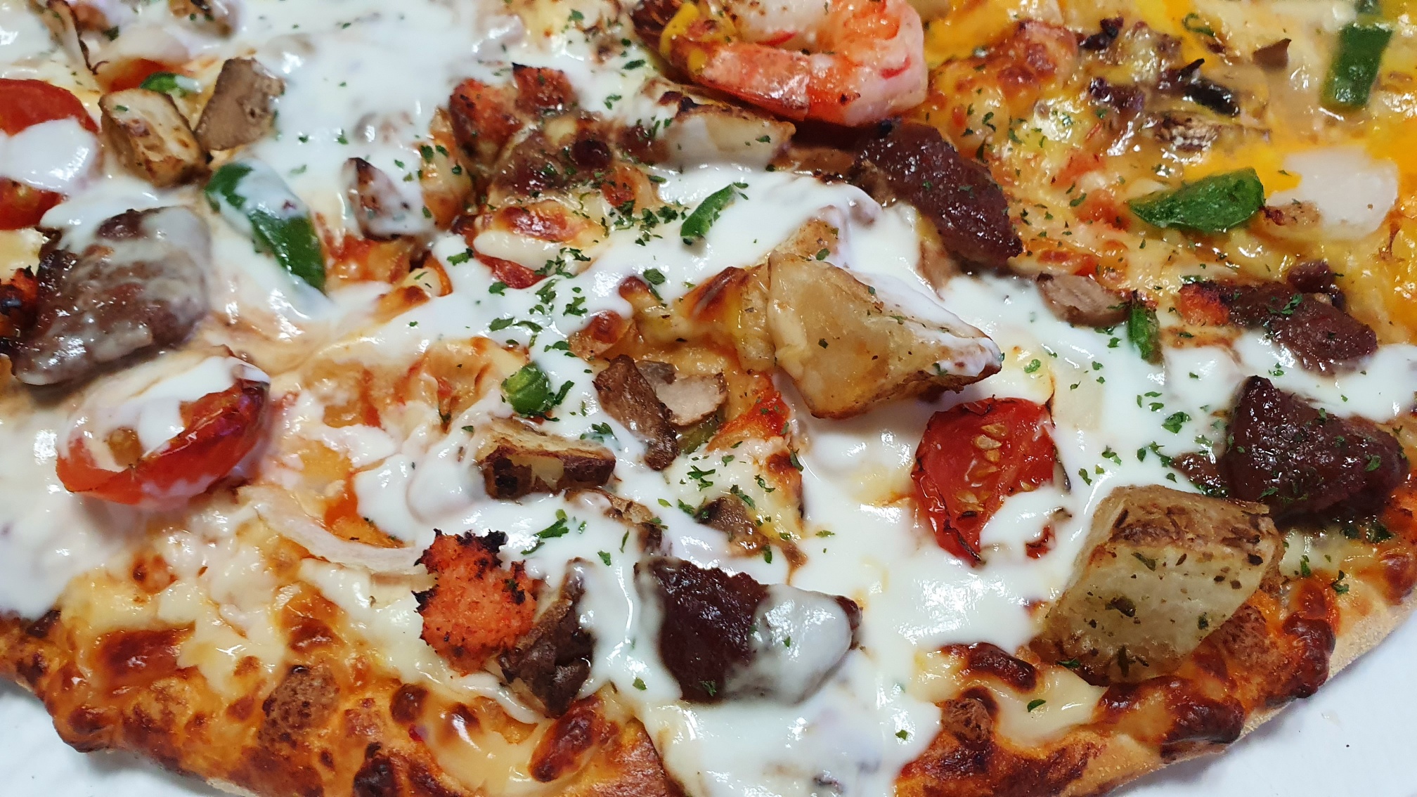 육지와 바다에 만남이라는 블랙타이거 슈림프 피자다 씹을 때 새우살이 톡톡씨ㅃ이는 것이 식감이 아주 좋다. 물론 맛도 개인적으로는 스테이크 피자보다 이게 더 좋다. 해산물을 좋아하는 것일 수도 있겠다 두툼한 감자와 다양한 토핑들이 입맛을 돋우는 그런 맛이다.
