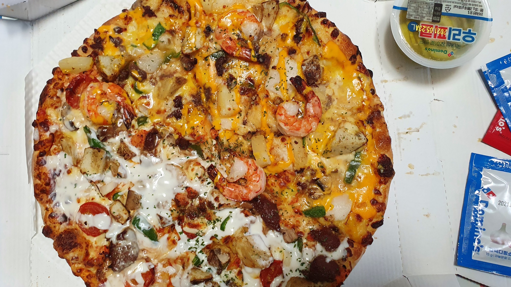 도우를 씬으로 선택하지 못한게 실수였다. 개인적으로 피자는 씬 도우를 좋아하는데, 아무 생각 없이 쿠폰번호만 입력하고 시킨 탓에 선택권은 없었다. 피자는 위 사진처럼, 한 가지 종류가 아니다. 피자 맛은 뭘 먹어도 맛있긴 하고 토핑에 따라 맛이 조금씩 변할 뿐이라 어떤 게 더 맛있고 맛없다 등을 평가하기가 곤란한 음식이기도 하다