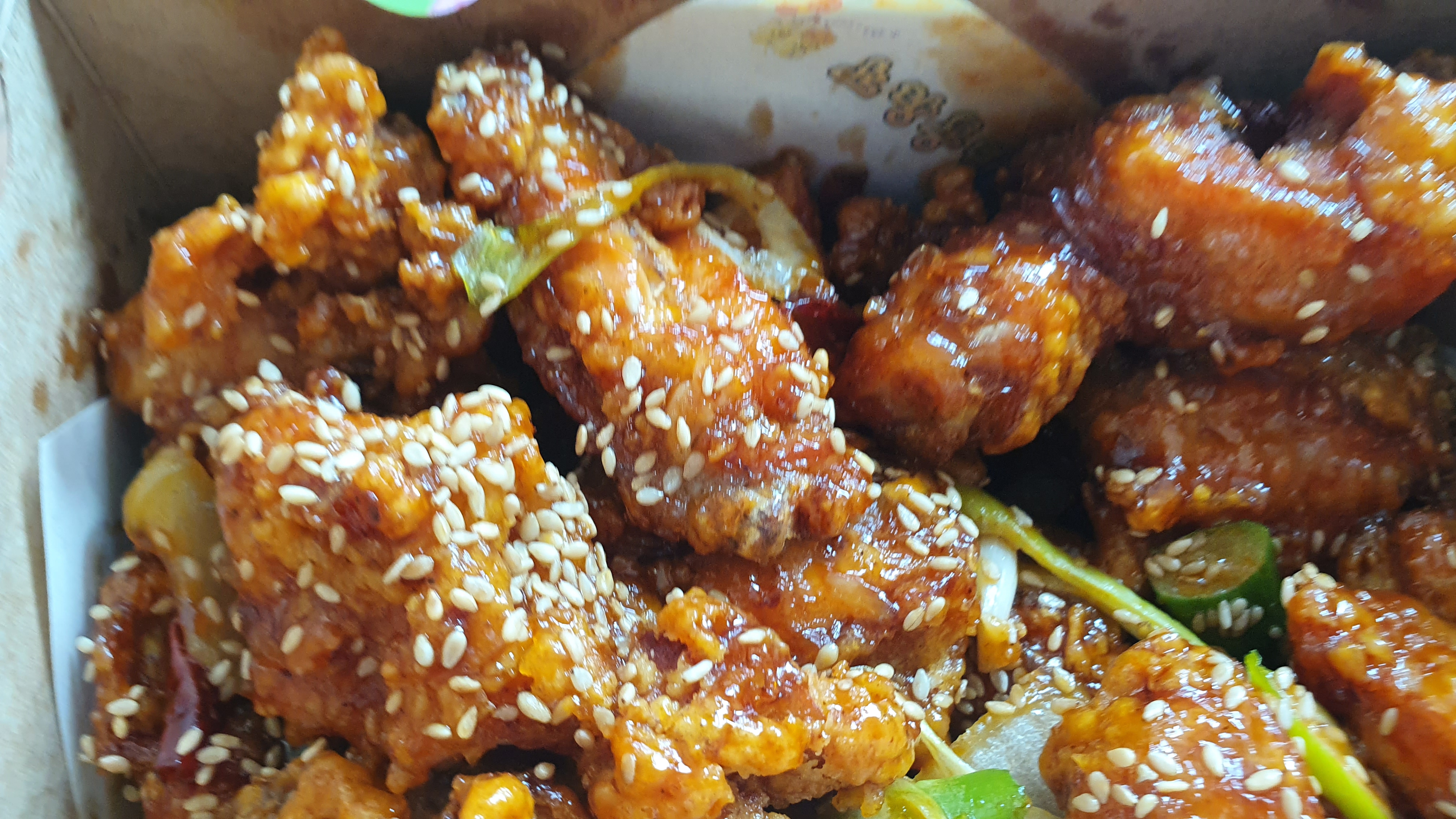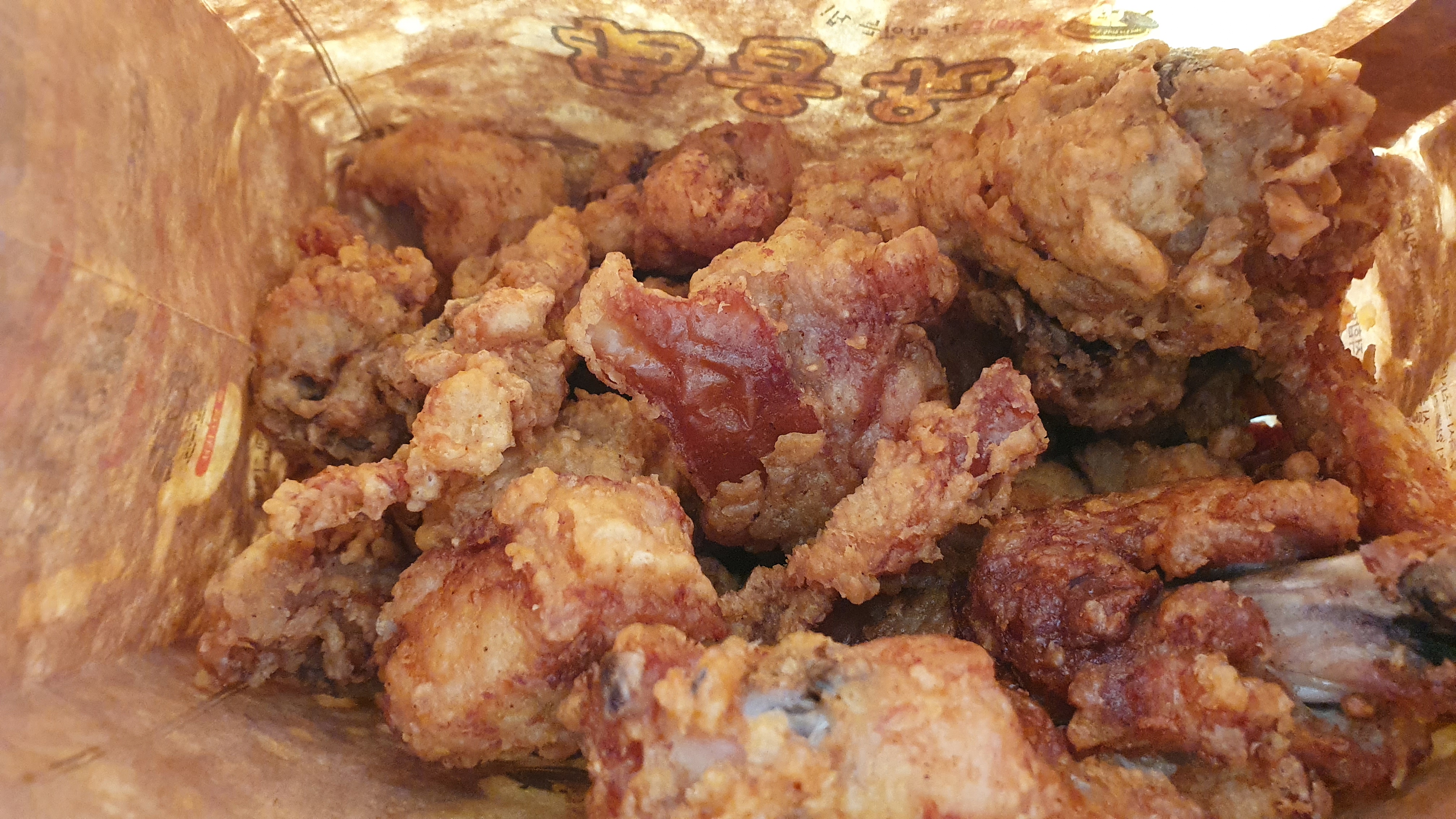 치킨용기 박스에 봉인해제라는 글씨로 쓰인 스티커가 큼지막하게 붙어있었다. 박스 안에 들어 있는 치킨은 바로 깐풍치킨이다 박스를 개봉하자마자 진하게 올라오는 깐풍 양념에 향이 입맛을 도구 었다. 닭고기도 질기지 않고 부드러웠고, 치킨에 튀김옷도 바삭했다. 겉바속촉이 제법 잘 어울리는 치킨에, 양념도 골고루 배어있어서 깐풍치킨은 꽤나 괜찮은 선택이었다