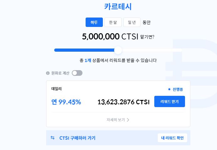 위 이미지처럼 본인이 원하는 만큼에 코인을 구매하거나 맡기고 거기에 따른 배당을 받는 것이다. 스테이킹에 이자율을 1% 부터 위처럼 99% 이상까지 천차만별로 형성되어 있다. 스테이킹이 안정적인 투자라고 생각하는 투자자들이 많아지면서, 스테이킹에 시장도 점차커져가고 있고, 거기에 따른 코인 시세 유지에도 도움이 되고 있다. 또한, 새로운 블로체인 코인 프로젝트도 스테이킹상품을 내놓고 있다. 위 이미지는 코인원 거래소에 운영되고 있는 상품중에 하나이며, 스테이킹 상품은 다른 거래소에서도 많이 진행하고 있다.